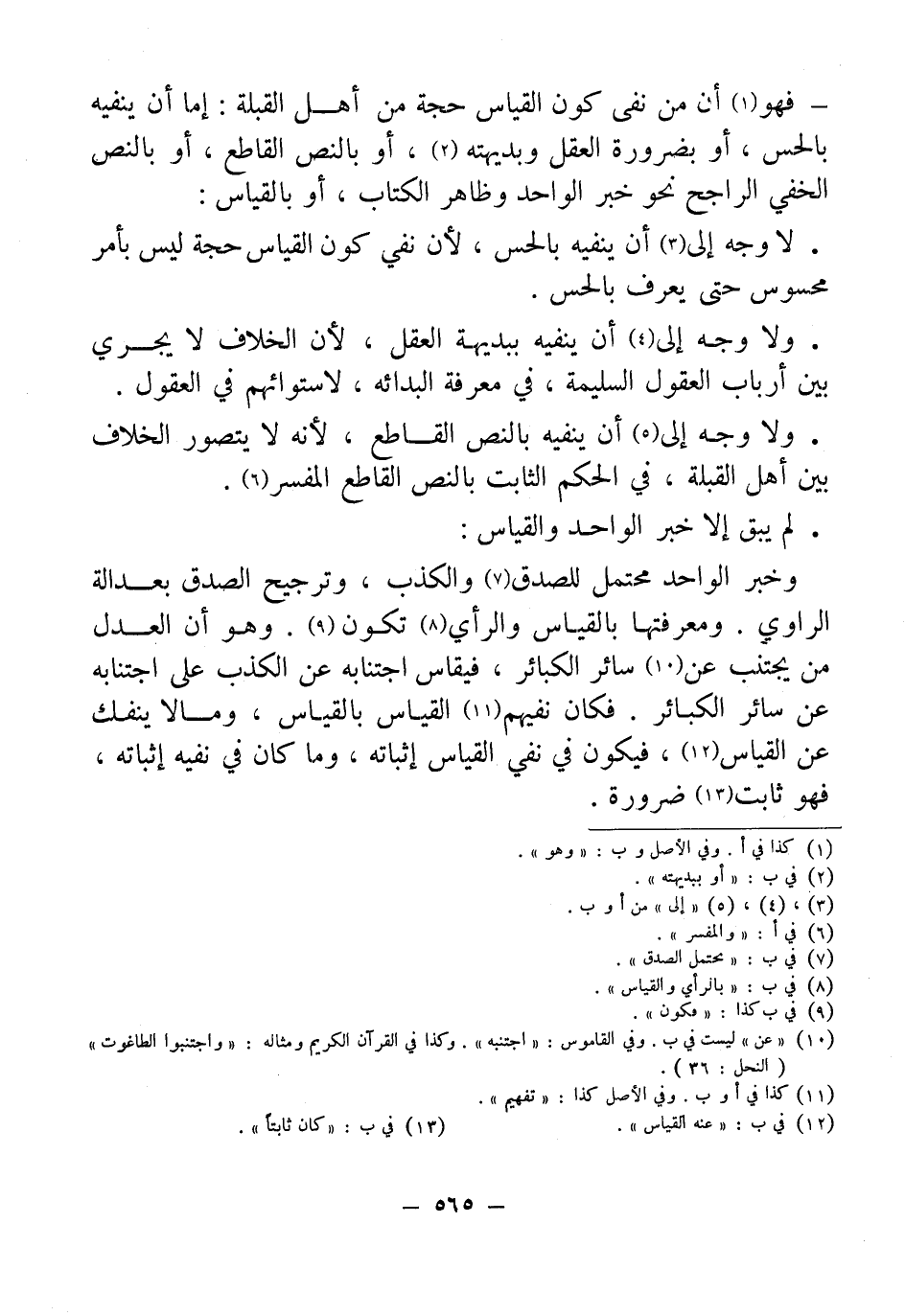 - فهو (¬1) أن من نفى كون القياس حجة من أهل القبلة: إما أن ينفيه بالحس، أو بضرورة العقل وبديهته (¬2)، أو بالنص القاطع، أو بالنص الخفي الراجح نحو خبر الواحد وظاهر الكتاب، أو بالقياس: