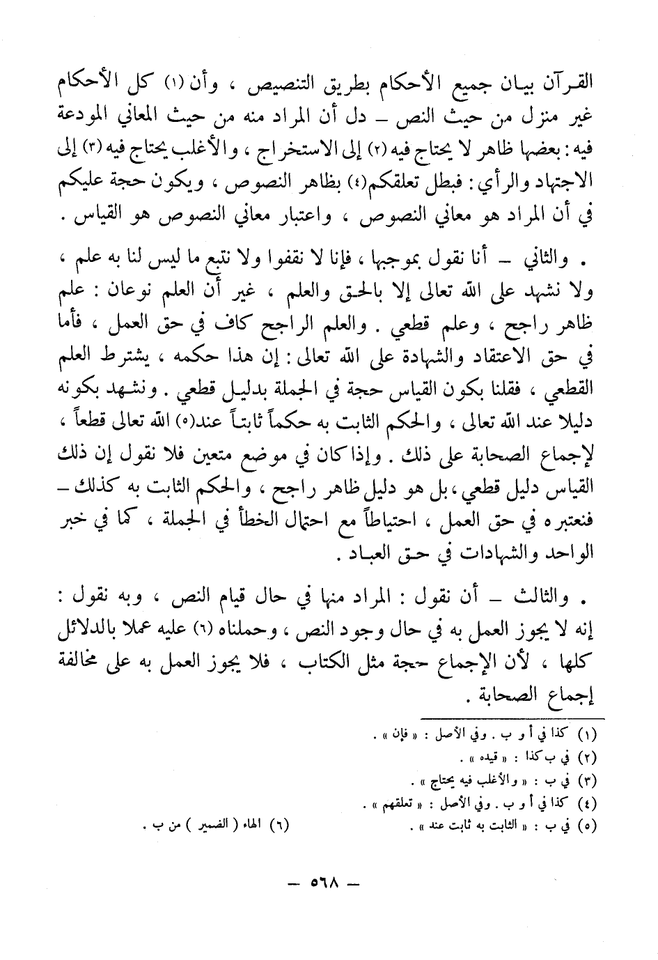 • والثاني - أنا نقول بموجبها، فإنا لا نقفوا ولا نتبع ما ليس لنا به علم، ولا نشهد على الله تعالى إلا بالحق والعلم، غير أن العلم نوعان: علم ظاهر راجح، وعلم قطعي. والعلم الراجح كاف في حق العمل، فأما في حق الاعتقاد والشهادة على الله تعالى: إن هذا حكمه، يشترط العلم القطعي، فقلنا بكون القياس حجة في الجملة بدليل قطعي. ونشهد بكونه دليلا عند الله تعالى، والحكم الثابت به حكماً ثابتاً عند (¬5) الله تعالى قطعاً، لإجماع الصحابة على ذلك. وإذا كان في موضع متعين فلا نقول إن ذلك القياس دليل قطعي، بل هو دليل ظاهر راجح، والحكم الثابت به كذلك - فنعتبره في حق العمل، احتإطاً مع احتمال الخطأ في الجملة، كما في خبر الواحد والشهادات في حق العباد.