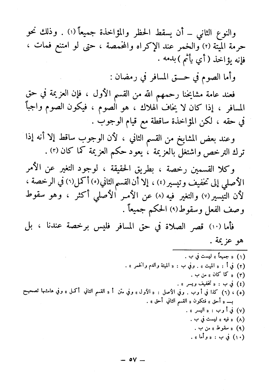 فعند عامة مشايخنا رحمهم الله من القسم الأول، فإن العزيمة في حق المسافر، إذا كان لا يخاف الهلاك، هو الصوم، فيكون الصوم واجبًا في حقه، لكن المؤاخذة ساقطة مع قيام الوجوب.