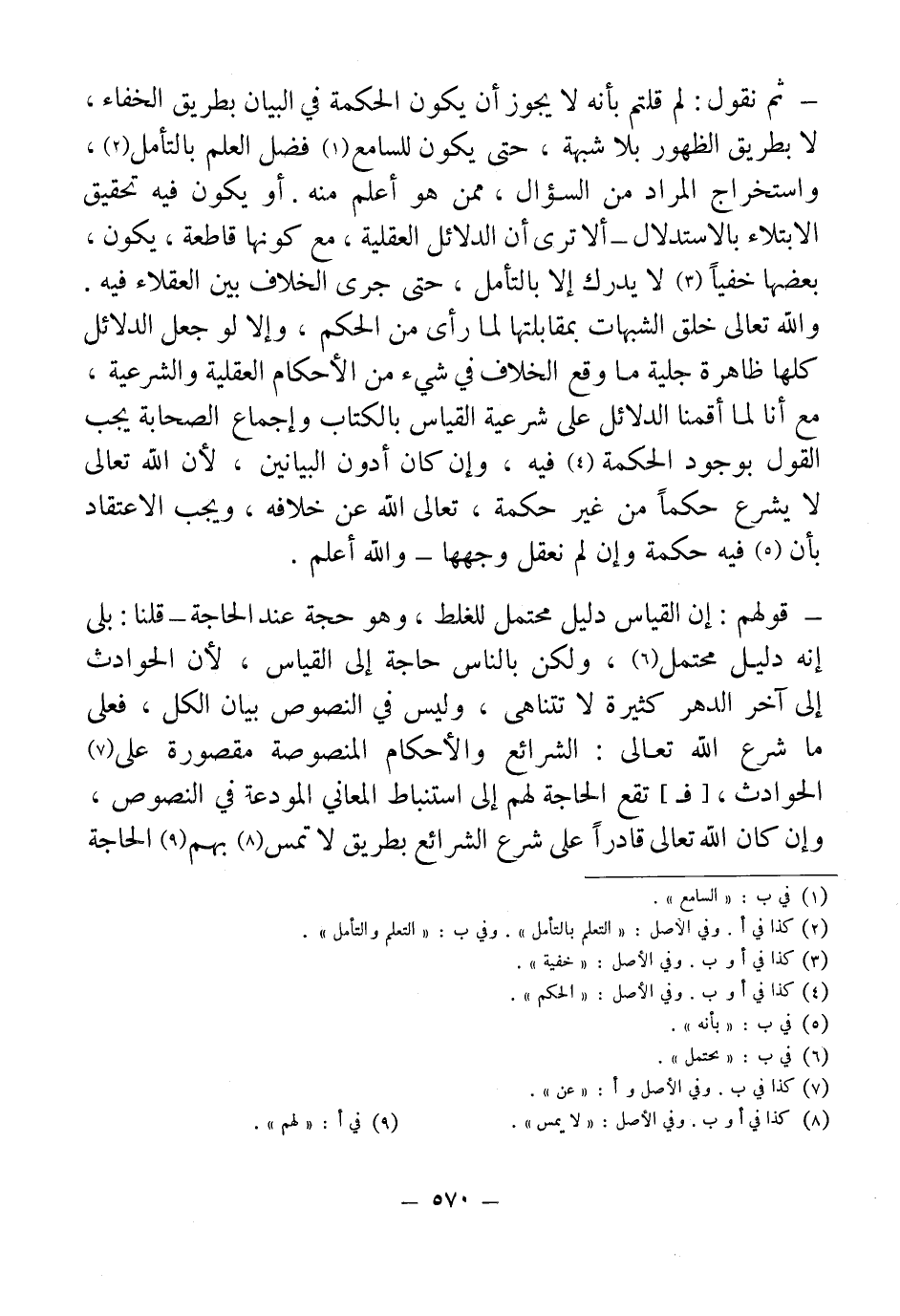 - ثم نقول: لم قلتم بأنه لا يجوز أن يكون الحكمة في البيان بطريق الخفاء، لا بطريق الظهور بلا شبهة، حتى يكون للسامع (¬1) فضل العلم بالتأمل (¬2)، واستخرج المراد من السؤال، ممن هو أعلم منه. أو يكون فيه تحقيق الابتلاء بالاستدلال - ألا ترى أن الدلائل العقلية، مع كونها قاطعة، يكون، بعضعها خفياً (¬3) لا يدرك إلا بالتأمل، حتى جرى الخلاف بين العقلاء فيه. والله تعالى خلق الشبهات بمقابلتها لما رأى كل من الحكم، وإلا لو جعل الدلائل كلها ظاهرة جلية ما وقع الخلاف في شيء من الأحكام العقلية والشرعية، مع أنا لما أقمنا الدلائل على شرعية القياس بالكتاب وإجماع الصحابة يجب القول بوجود الحكمة (¬4) فيه، وإن كان أدون البيانين، لأن الله تعالى لا يشرع حكماً من غير حكمة، تعالى الله عن خلافه، ويجب الاعتقاد بأن (¬5) فيه حكمة وإن لم نعقل وجهها - والله أعلم.