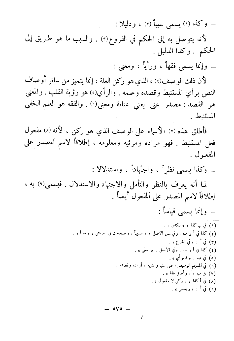 لأن ذلك الوصف (¬4)، الذي هو ركن العلة، إنما يتميز من سائر أو صاف النص برأي المستنبط وقصده وعلمه. والرأي (¬5) هو رؤية القلب. والمعنى هو القصد: مصدر عنى يعني عناية ومعنى (¬6). والفقه هو العلم الخفي المستنبط.