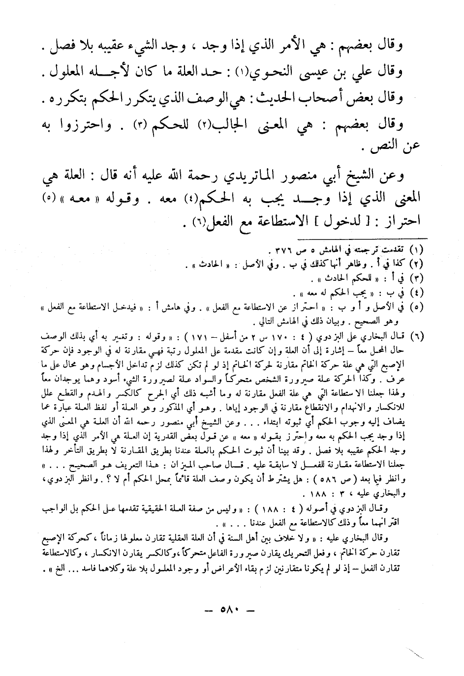 (¬6) قال البخاري على البزدوي (4: 170 س 2 من أسفل - 171): "وقوله: وتغير به أي بذلك الوصف حال المحل معاً - إشارة إلى أن العلة وإن كانت مقدمة على المعلول رتبة فهي مقارنة له في الوجود فإن حركة الإصبع التي هي علة حركة الخاتم مقارنة لحركة الخاتم إذ لو لم تكن كذلك لزم تداخل الأجسام وهو محال على ما عرف. وكذا الحركة علة صيرورة الشخص متحركاً والسواد علة لصيرورة الشيء أسود وهما يوجدان معاً ولهذا جعلنا الاستطاعة التي هي علة الفعل مقارنة له وما أشبه ذلك أي الجرح كالكسر والهدم والقطع علل للانكسار والانهدام والانقطاع مقارنة في الوجود إياها. وهو أي الذكور وهو العلة أو لفظ العلة عبارة عما يضاف إليه وجوب الحكم أي ثبوته ابتداء ... وعن الشيخ أبي منصور رحمه الله أن العلة هي المعنى الذي إذا وجد يجب الحكم به معه واحترز بقوله "معه" عن قول بعض القدرية إن العلة هي الأمر الذي إذا وجد وجد الحكم عقيبه بلا فصل. وقد بينا أن ثبوت الحكم بالعلة عندنا بطريق المقارنة لا بطريق التأخر ولهذا جعلنا الاستطاعة مقارنة للفعل لا سابقة عليه. قال صاحب الميزان: هذا التعريف هو الصحيح ... " وانظر فيما بعد (ص 586): هل يشترط أن يكون وصف العلة قائماً بمحل الحكم أم لا؟. وانظر البزدوي، والبخاري عليه، 3: 188.