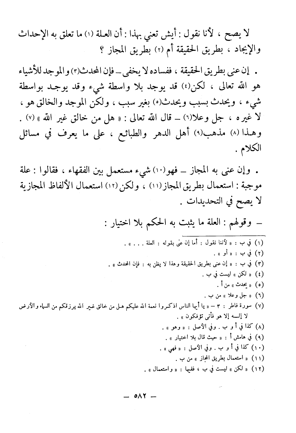 • إن عنى بطريق الحقيقة، ففساده لا يخفى - فإن المحدث (¬3) والموجد للأشياء هو الله تعالى، لكن (¬4) قد يوجد بلا واسطة شيء وقد يوجد بواسطة شيء، ويحدث بسبب ويحدث (¬5) بغير سبب، ولكن الموجد والخالق هو، لا غيره، جل وعلا (¬6) - قال الله تعالى: "هل من خالق غير الله" (¬7). وهذا (¬8) مذهب (¬9) أهل الدهر والطبائع، على ما يعرف في مسائل الكلام.