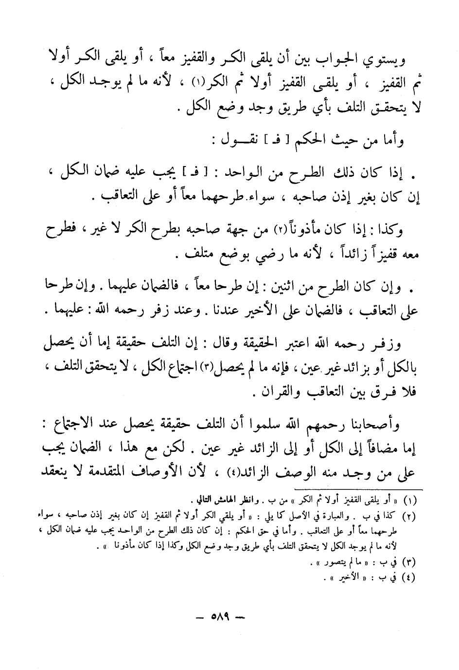 (¬2) كذا في ب. والعبارة في الأصل كما يلي: "أو يلقي الكر أولا ثم القفيز إن كانا بغير إذن صاحبه، سواء طرحهما معاً أو على التعاقب. وأما في حق الحكم: إن كان ذلك الطرح من الواحد يجب عليه ضمان الكل، لأنه ما لم يوجد الكل لايتحقق التلف بأي طريق وجد وضع الكل وكذا إذا كان مأذونا".