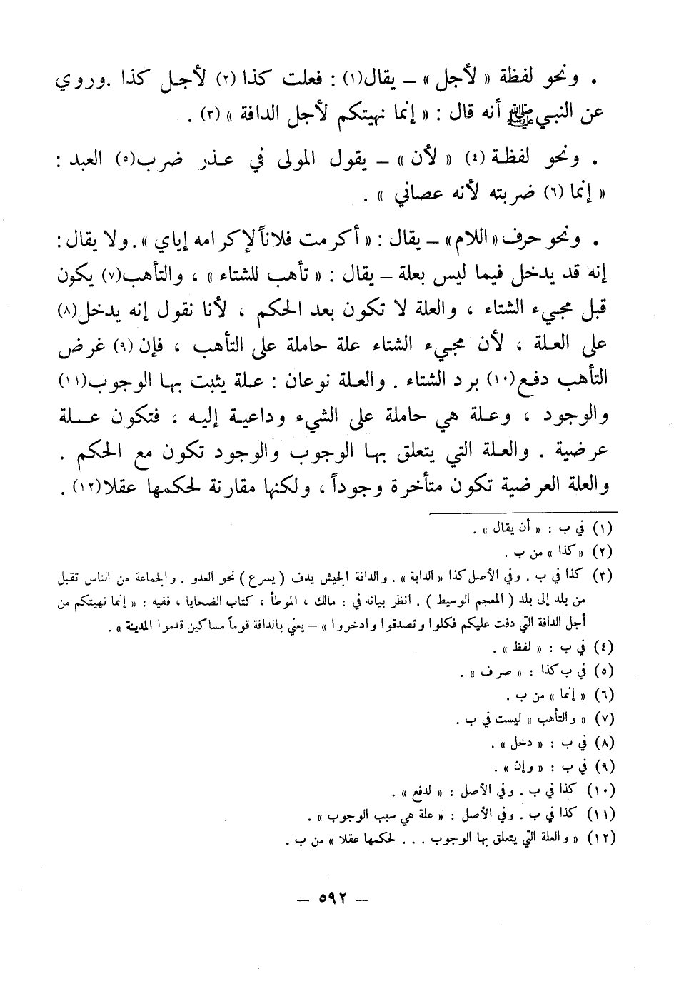 • ونحو حرف "اللام" - يقال: "أكرمت فلاناً لإكرامه إياي". ولا يقال: إنه قد يدخل فيما ليس بعلة - يقال: "تأهب للشتاء"، والتأهب (¬7) يكون قبل مجيء الشتاء، والعلة لا تكون بعد الحكم، لأنا نقول إنه يدخل (¬8) على العلة، لأن مجيء الشتاء علة حاملة على التأهب، فإن (¬9) غرض التأهب دفع (¬10) برد الشتاء. والعلة نوعان: علة يثبت بها، الوجوب (¬11) والوجود، وعلة هي حاملة على الشيء وداعية إلية، فتكون علة عرضية. والعلة التي يتعلق بها الوجوب والوجود تكون مع الحكم. والعلة العرضية تكون متأخرة وجوداً، ولكنها مقارنة لحكمها عقلا (¬12).