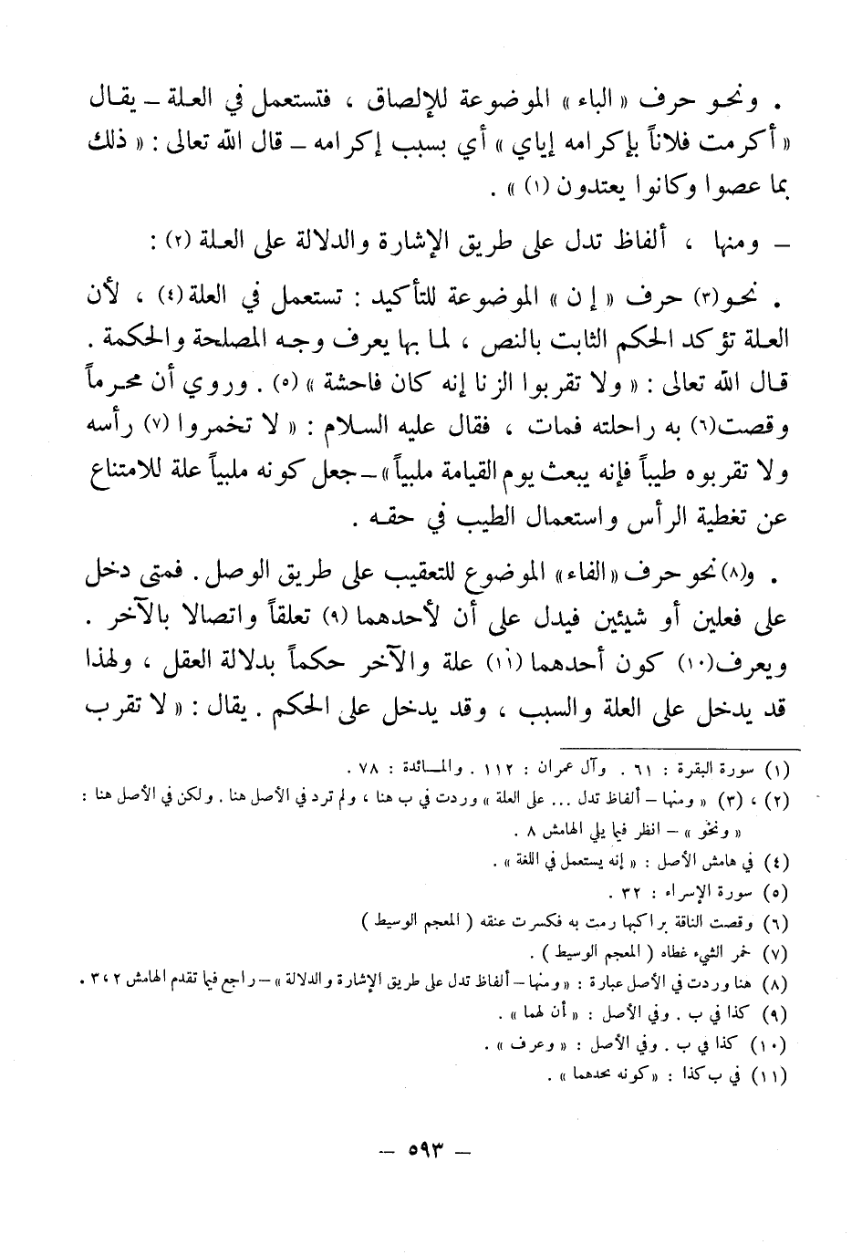 • نحو (¬3) حرف "إن" الوضوعة للتأكيد: تستعمل في العلة (¬4)، لأن العلة تؤكد الحكم الثابت بالنص، لما بها يعرف وجه المصلحة والحكمة. قال الله تعالى: "ولا تقربوا الزنا إنه كان فاحشة" (¬5). وروي أن محرماً وقصت (¬6) به راحلته فمات، فقاك عليه السلإم: "لا تخمروا (¬7) رأسه ولا تقربوه طيباً فإنه يبعث يوم القيامة ملبياً" - جعل كونه ملبياً علة الامتناع عن تغطية الرأس واستعمال الطيب في حقه.