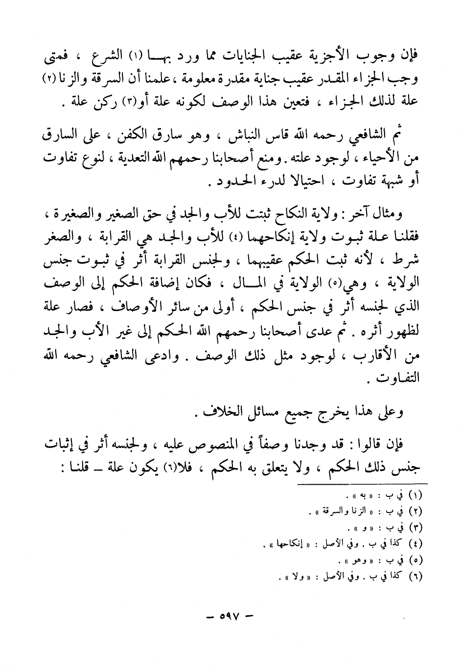 ومثال آخر: ولاية النكاح ثبتت للأب والجد في حق الصغر والصغيرة، فقلنا علة ثبوت ولاية إنكاحهما (¬4) للأب والجد هي القرابة، والصغر شرط، لأنه ثبت الحكم عقيبهما، ولجنس القرابة أثر في ثبوت جنس الولاية، وهي (¬5) الولاية في المال، فكان إضافة الحكم إلى الوصف الذي لجنسه أثر في جنس الحكم، أولى من سائر الأوصاف، فصار علة لظهور أثره. ثم عدى أصحابنا رحمهم الله الحكم إلى غير الأب والجد من الأقارب،. لوجود مثل ذلك الوصف. وادعى الشافعي رحمه الله التفاوت.