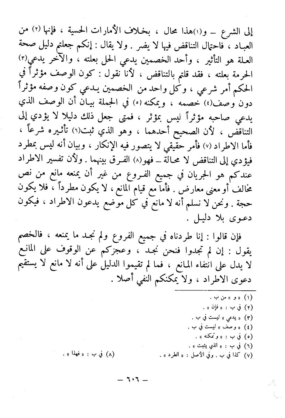 إلى الشرع - و (¬1) هذا محال، بخلاف الأمارات الحسية، فإنها (¬2) من العباد، فاحتمال التناقض فيها لا يضر. ولا يقال: إنكم جعلتم دليل صحة العلة هو التأثير، وأحد الخصمين يدعي الحل بعلته، والآخر يدعي (¬3) الحرمة بعلته، فقد قلتم بالتناقض، لأنا نقول: كون الوصف مؤثراً في الحكم أمر شرعي، وكل واحد من الخصمين يدعي كون وصفه مؤثراً دون وصف (¬4) خصمه، ويمكنه (¬5) في الجملة بيان أن الوصف الذي يدعي صاحبه مؤثراً ليس بمؤثر، فمتى جعل ذلك دليلا لا يؤدي إلى التناقض، لأن الصحيح أحدهما، وهو الذي ثبت (¬6) تأثيره شرعاً، فأما الاطراد (¬7) فأمر حقيقي لا يتصور فيه الإنكار، وبيان أنه ليس بمطرد فيؤدي إلى التناقض لا محالة - فهو (¬8) الفرق بينهما. ولأن تفسير الاطراد عندكم هو الجريان في جميع الفروع من غير أن يمنعه مانع من نص مخالف أو معنى معارض. فأما مع قيام المانع، لا يكون مطرداً، فلا يكون حجة. ونحن لا نسلم أنه لا مانع في كل موضع يدعون الاطراد، فيكون دعوى بلا دليل.