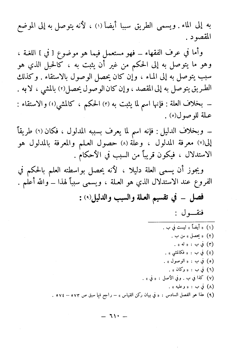فصل - في تقسيم العلة والسبب والدليل (¬9):