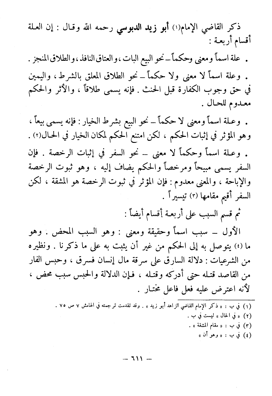 ذكر القاضي الإمام (¬1) أبو زيد الدبوسي رحمه الله وقال: إن العلة أقسام أربعة: