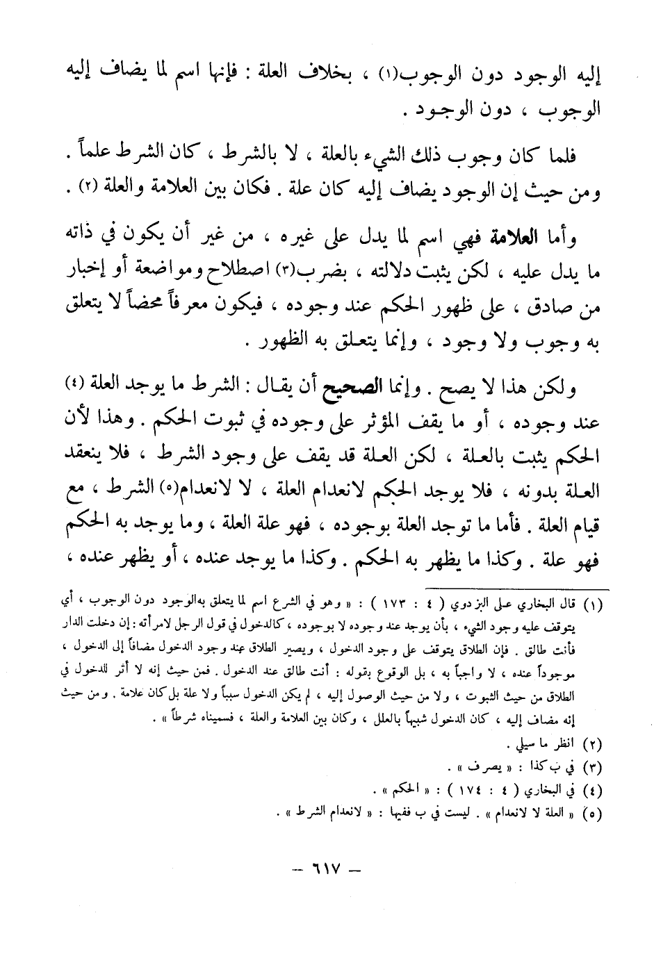(¬1) قال البخاري على البزدوي (4: 173): "وهو في الشرع اسم لما يتعلق به الوجود دون الوجوب، أي يتوقف عايه وجود الشيء، بأن يوجد عند وجوده لا بوجوده، كالدخول في قول الرجل لامرأته: إن دخلت الدار فأنت طالق. فإن الطلاق يتوقف على وجود الدخول، ويصير الطلاق عند وجود الدخول مضافًا إلى الدخول، موجودًا عنده، لا واجبًا به، بل الوقوع في قوله: أنت طالق عند الدخول. فمن حيث إنه لا أثر للدخول في الطلاق من حيث الثبوت، ولا من حيث الوصول إليه، لم يكن الدخول سببًا ولا علة بل كان علامة. ومن حيث إنه مضاف إله، كان الدخول شبيهًا بالعلل، وكان بين العلامة والعلة، فسميناه شرطًا".