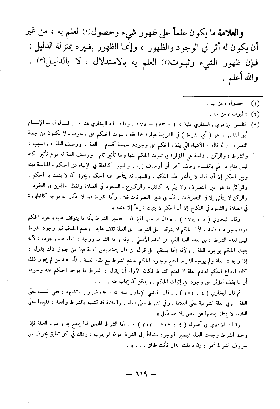 وقال البخاري (4: 174): " قال صاحب الميزان: تفسير الشرط بأنه ما يتوقف عليه وجود الحكم دون وجوبه، فاسد، لأن الحكم لا يتوقف على الشرط. بل العلة تقف عليه. وعدم الحكم قبل وجود الشرط ليس لعدم الشرط، بل لعدم العلة الذي هو العدم الأصلي. فإذا وجد الشرط ووجدت العلة عند وجوده، لأنه يثبت الحكم بوجود العلة. ولأنه إنما يستقيم على قول من قال بتخصيص العلة فإن من جوز ذلك يقول: إذا وجدت العلة ولم يوجد الشرط امتنع وجود الحكم لعدم الشرط مع بقاء العلة. فأما عند من لم يجوز ذلك كان امتناع الحكم لعدم العلة لا لعدم الشرط فكان الأولى أن يقال: الشرط ما يوجد الحكم عند وجوده أو ما يقف المؤثر على وجوده في إثبات الحكم. ويمكن أن يجاب عنه ... "