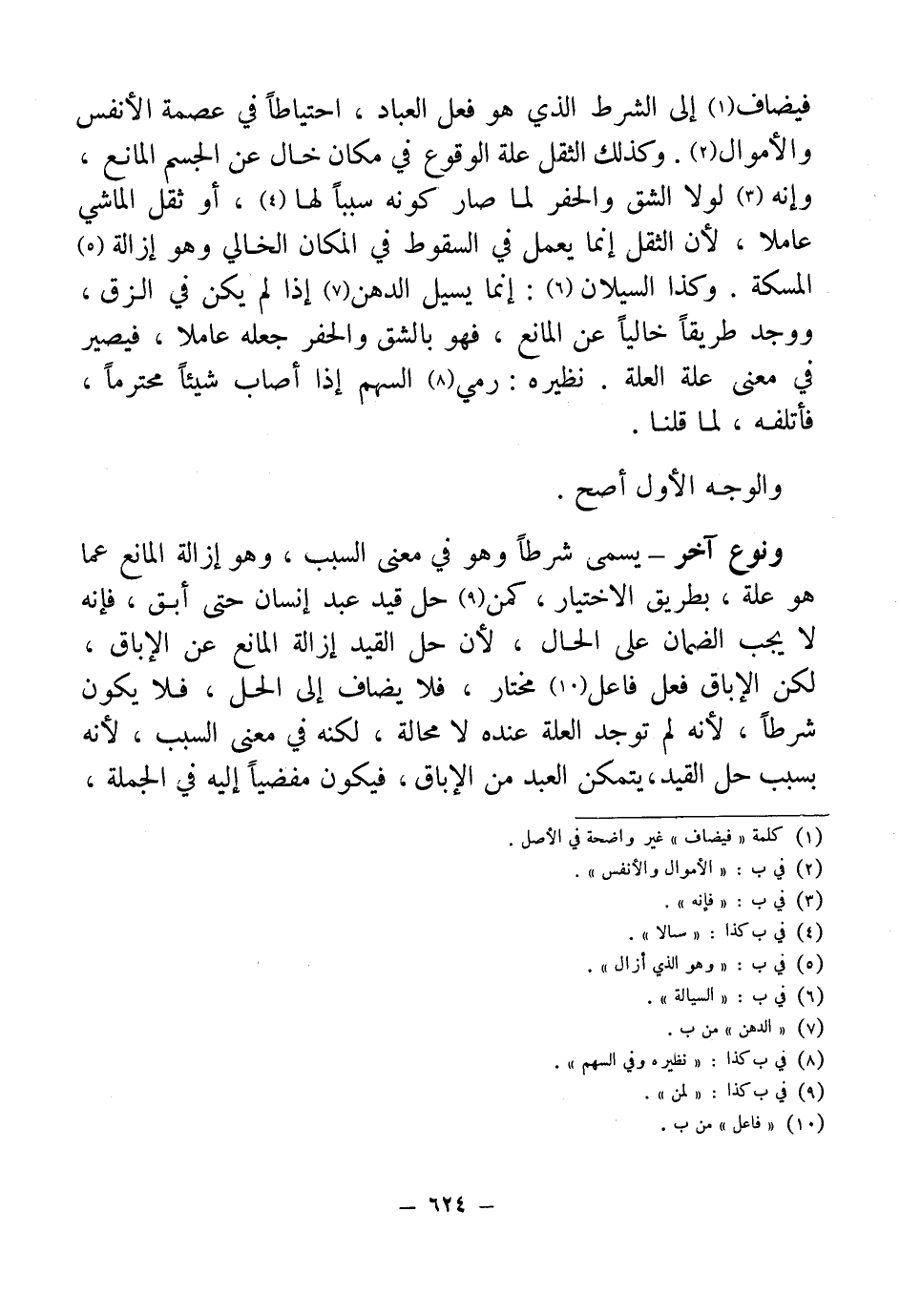 فيضاف (¬1) إلى الشرط الذي هو فعل العباد، احتياطًا في عصمة الأنفس والأموال (¬2). وكذلك الثقل علة الوقوع في مكان خال عن الجسم المانع، وإنه (¬3) ولا الشق والحفر لما صار كونه سببًا لها (¬4)، أو ثقل الماشي عاملا، لأن الثقل إنما يعمل في السقوط في المكان الخالي وهو إزالة (¬5) المسكة. وكذا السيلان (¬6): إنما يسيل الدهن (¬7) إذا لم يكن في الزق، ووجد طريقًا خاليًا عن المانع، فهو بالشق والحفر جعله عاملا، فيصير في معنى علة العلة. نظيره: رمي (¬8) السهم إذا أصاب شيئًا محترمًا، فأتلفه، لما قلنا.