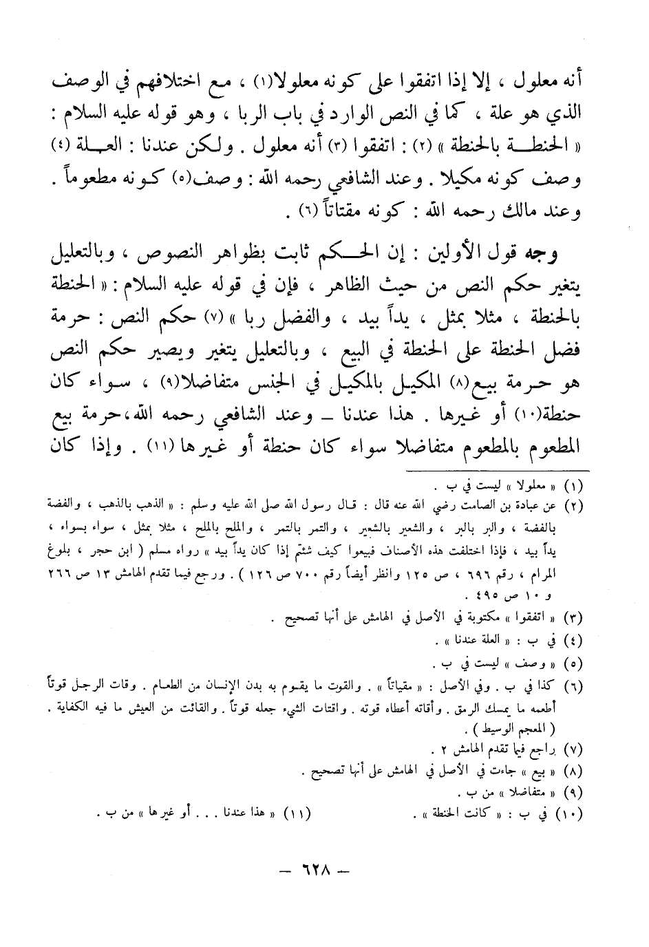 (¬2) عن عبادة بن الصامت رضي الله عنه قال: قال رسول الله - صلى الله عليه وسلم -: "الذهب بالذهب، والفضة بالفضة، والبر بالبر، والشعير بالشعير، والتمر بالتمر، والملح بالملح، مثلا بمثل، سواء بسواء، يدًا بيد، فإذا اختلفت هذه الأصناف فبيعوا كيف شئتم إذا كان يدًا بيد" رواه مسلم (ابن حجر، في بلوغ المرام، رقم 696، ص 125 وانظر أيضًا رقم 700 ص 126). ورجع فيما تقدم الهامش 13 ص 266 و 10 ص 495.