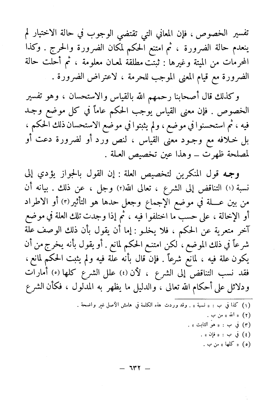 تفسير الخصوص، فإن المعاني التي تقتضي الوجوب في حالة الاختيار لم ينعدم حالة الضرورة، ثم امتنع الحكم لمكان الضرورة والحرج. وفي المحرمات من الميتة وغيرها: ثبتت مطاقة لمعان معلومة، ثم أحلت حالة الضرورة مع قيام المعنى الوجب للحرمة، لاعتراض الضرورة.