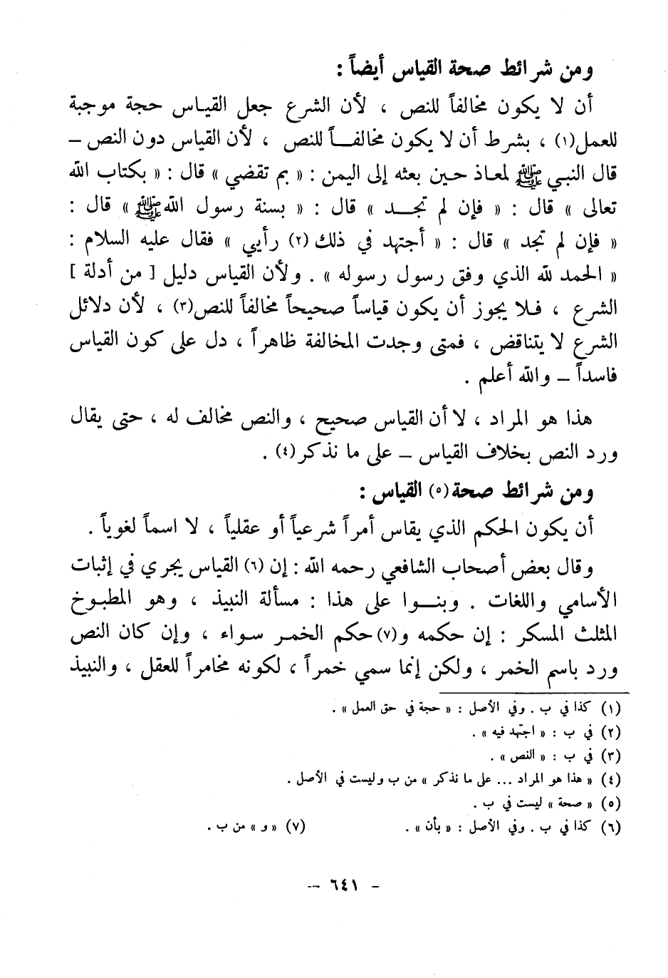 أن لا يكون مخالفًا للنص، لأن الشرع جعل القياس حجة موجبة للعمل (¬1)، بشرط أن لا يكون مخالفًا للنص، لأن القياس دون النص - قال النبي - صلى الله عليه وسلم - لمعاذ حين بعثه إلى اليمن: "بم تقضي" قال: "بكتاب الله تعالى" قال: "فإن لم تجد" قال: "بسنة رسول الله - صلى الله عليه وسلم - قال: "فإن لم تجد" قال: "أجتهد في ذلك (¬2) رأيي" فقال عليه السلام: "الحمد لله الذي وفق رسول رسوله". ولأن القياس دليل [من أدلة] الشرع، فلا يجوز أن يكون قياسًا صحيحًا مخالفًا للنص (¬3)، لأن دلائل الشرع لا يتناقض، فمتى وجدت المخالفة ظاهرًا، دل على كون القياس فاسدًا - والله أعلم.