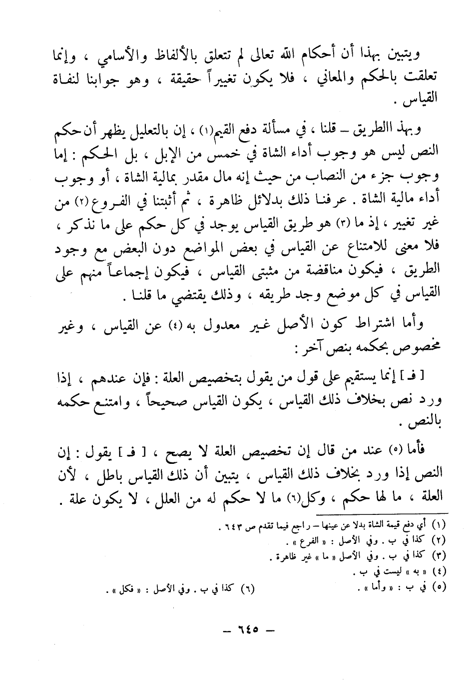 وبهذ الطريق - قلنا، في مسألة دفع القيم (¬1)، إن بالتعليل يظهر أن حكم النص ليس هو وجوب أداء الشاة في خمس من الإبل، بل الحكم: إما وجوب جزء من النصاب من حيث إنه مال مقدر بمالية الشاة، أو وجوب أداء مالية الشاة. عرفنا ذلك بدلائل ظاهرة، ثم أثبتنا في الفروع (¬2) من غير تغيير، إذ ما (¬3) هو طريق القياس يوجد في كل حكم على ما نذكر، فلا معنى للامتناع عن القياس في بعض المواضع دون البعض مع وجود الطريق، فيكون مناقضة من مثبتى القياس، فيكون إجماعًا منهم على القياس في كل موضع وجد طريقه، وذلك يقتضي ما قلنا