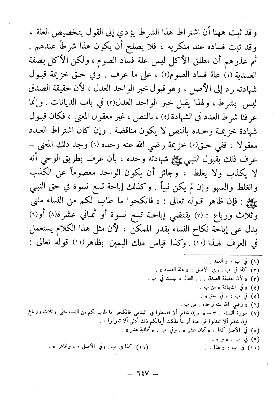 وقد ثبت ههنا أن اشتراط هذا الشرط يؤدي إلى القول بتخصيص العلة، وقد ثبت فساده عند منكريه، فلا يصلح أن يكون هذا شرطًا عندهم. ثم عذرهم أن مطلق الأكل ليس علة فساد الصوم، ولكن الأكل بصفة العمدية (¬1) علة فساد الصوم (¬2)، على ما عرف. وفي حق خزيمة قبول شهادته رد إلى الأصل، وهو قبول خبر الواحد العدل، لأن حقيقة الصدق ليس بشرط، ولهذا يقبل خبر الواحد العدل (¬3) في باب الديانات. وإنما عرفنا شرط العدد في الشهادة (¬4)، بالنص، غير معقول المعنى، فكان قبول شهادة خزيمة وحده بالنص لا يكون مناقضة. وإن كان اشتراط العدد معقولا، ففي حق (¬5) خزيمة رضي الله عنه وحده (¬6) وجد ذلك المعنى - عرف ذلك بقبول النبي - صلى الله عليه وسلم - شهادته وحده، بأن عرف بطريق الوحي أنه لا يكذب ولا يغلط، وجائز أن يكون الواحد معصومًا عن الكذب والغلط والسهو وإن لم يكن نبيًّا. وكذلك إباحة تسع نسوة في حق النبي - صلى الله عليه وسلم -: فان ظاهر قوله تعالى: "فانكحوا ما طاب لكم من النساء مثنى وثلاث ورباع" (¬7) يقتضي إباحة تسع نسوة أو ثماني عشرة (¬8) أو (¬9) يدل على إباحة نكاح النساء بقدر الممكن، لأن مثل هذا الكلام يستعمل في العرف لهذا (¬10). وكذا قياس ملك اليمين بظاهر (¬11) قوله تعالى: