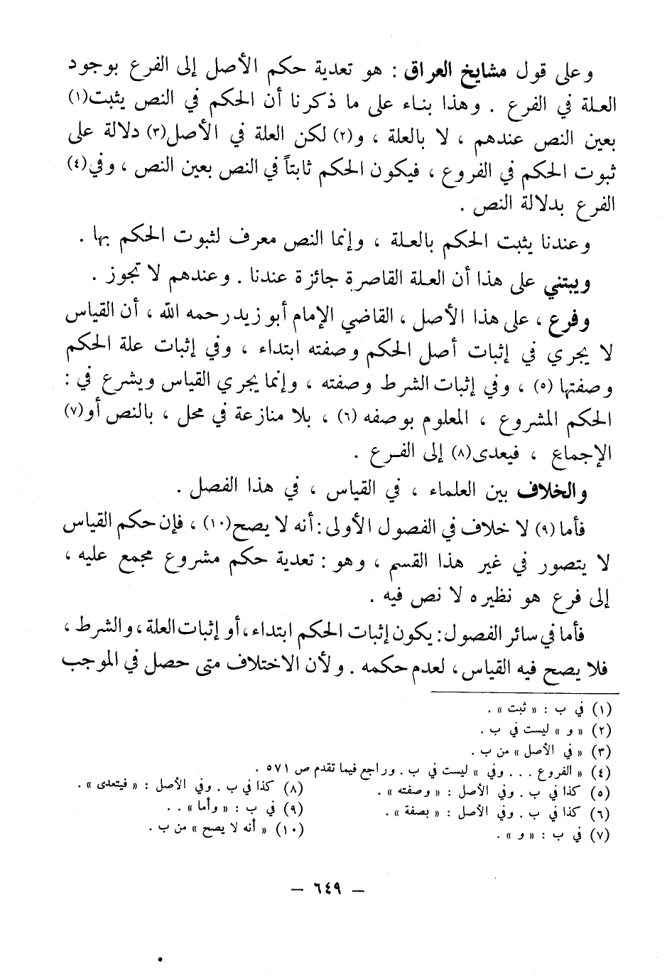 وفرع، على هذا الأصل، القاضي الإمام أبو زيد رحمه الله، أن القياس لا يجري في إثبات أصل الحكم وصفته ابتداء، وفي إثبات علة الحكم وصفتها (¬5)، وفي إثبات الشرط وصفته، وإنما يجري القياس ويشرع في: الحكم المشروع، المعلوم بوصفه (¬6)، بلا منازعة في محل، بالنص أو (¬7) الإجماع، فيعدى (¬8) إلى الفرع.