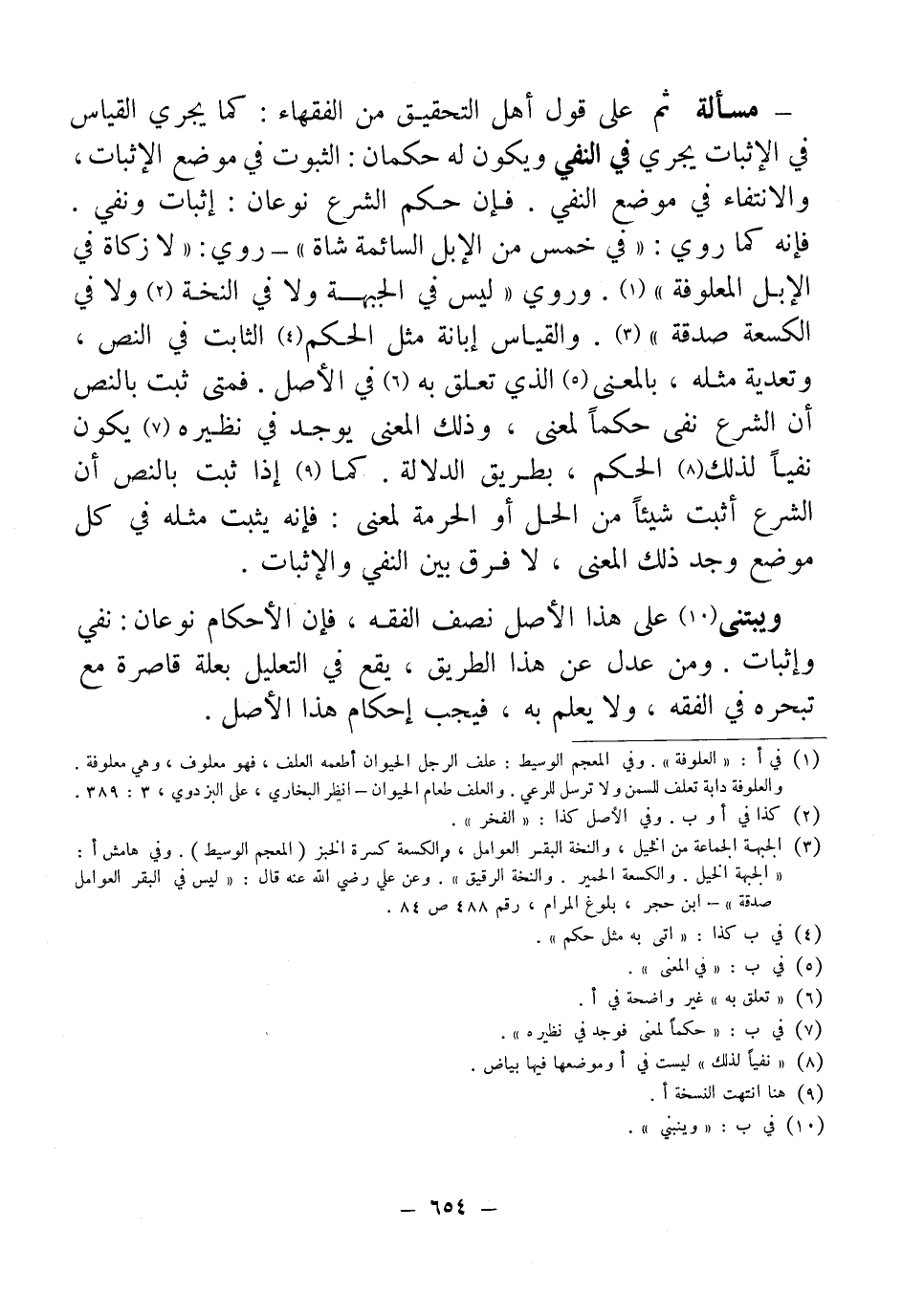 - مسألة ثم على قول أهل التحقيق من الفقهاء: كما يجري القياس في الإثبات يجري في النفي ويكون له حكمان: الثبوت في موضع الإثبات، والانتفاء في موضع النفي. فإن حكم الشرع نوعان: إثبات ونفي. فإنه كما روي: "في خمس من الإبل السائمة شاة" - روي: "لا زكاة في الإبل المعلوفة" (¬1). وروي "ليس في الجبهة ولا في النخة (¬2) ولا في الكسعة صدقة" (¬3). والقياس إبانة مثل الحكم (¬4) الثابت في النص، وتعدية مثله، بالمعنى (¬5) الذي تعلق به (¬6) في الأصل. فمتى ثبت بالنص أن الشرع نفي حكمًا لمعني، وذلك المعني يوجد في نظيره (¬7) يكون نفيًا لذلك (¬8) الحكم، بطريق الدلالة. كما (¬9) إذا ثبت بالنص أن الشرع أثبت شيئًا من الحل أو الحرمة لمعنى: فإنه يثبت مثله في كل موضع وجد ذلك المعنى، لا فرق بين النفي والإثبات.