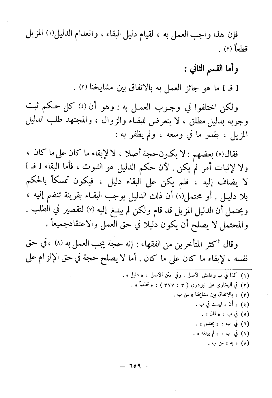 فقال (¬5) بعضهم: لا يكون حجة أصلا، لا لإبقاء ما كان على ما كان، ولا لإثبات أمر لم يكن. لأن حكم الدليل هو الثبوت، فأما البقاء [فـ] لا يضاف إليه، فلم يكن على البقاء دليل، فيكون تمسكًا بالحكم بلا دليل. أو محتمل (¬6) أن ذلك الدليل يوجب البقاء بقرينة تنضم إليه, ويحتمل أن الدليل المزيل قد قام ولكن لم يبلغ إليه (¬7) لتقصير في الطلب. والمحتمل لا يصلح أن يكون دليلا في حق العمل والاعتقاد جميعًا.