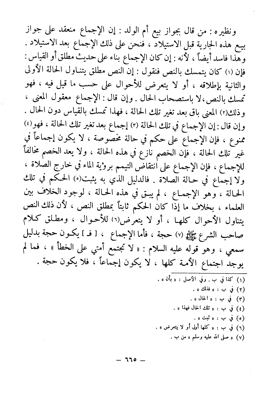 ونظيره: من قال بجواز بيع أم الولد: إن الإجماع كل منعقد على جواز بيع هذه الجارية في قبل الاستيلاد، فنحن على ذلك الإجماع بعد الاستيلاد. وهذا فاسد أيضاً، لأنه: إن كان الإجماع بناء على حديث مطلق أو القياس: فإن (¬1) كان ويتمسك بالنص فنقول: إن النص مطلق ويتناول الحالة الأولى والثانية بإطلاقه، أو لا ويتعرض للأحوال على حسب ما قيل فيه، فهو تمسك بالنص، لا باستصحاب الحال. وإن قال: الإجماع معقول المعنى، وذلك (¬2) المعنى باق بعد تغير تلك الحالة، فهذا تمسك بالقياس دون الحال. وإن قال: إن الإجماع في تلك الحالة (¬3) إجماع بعد تغير تلك الحالة، فهو (¬4) ممنوع، فإن الإجماع على حكم في حالة مخصوصة، لا يكون إجماعاً في غير تلك الحالة، فإن الخصم نازع في هذه الحالة، ولا يعد الخصم مخالفاً للإجماع، فإن الإجماع على انتقاض التيمم برؤية الماء في خارج الصلاة، ولا إجماع في حالة الصلاة. فالدليل الذي به يثبت (¬5) الحكم في تلك الحالة، وهو الإجماع، لم يبق في هذه الحالة، لوجود الخلاف بين العلماء، بخلاف ما إذا كان الحكم ثابتاً بمطلق النص، لأن ذلك النص يتناول الأحوال كلها، أو لا يتعرض (¬6) للأحوال، ومطلق كلام صاحب الشرع - صلى الله عليه وسلم - (¬7) حجة، فأما الإجماع، [فـ] يكون حجة بدليل سمعي، وهو قوله عليه السلام: "لا تجتمع أكل أمتي على الخطأ"، فما لم يوجد اجتماع الأمة كلها، لا يكون إجماعاً، فلا يكون حجة.