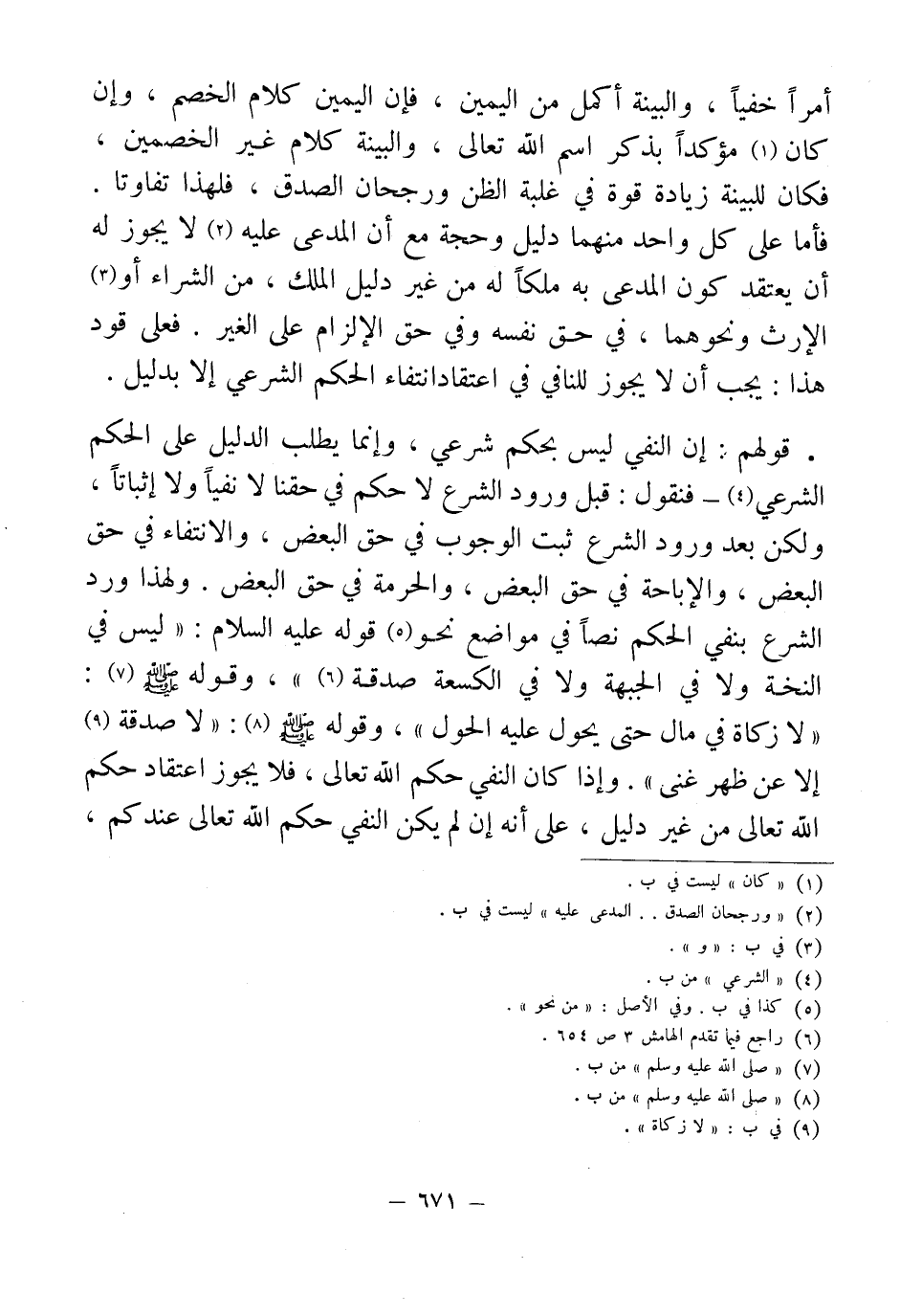 • قولهم: إن النفي ليس بحكم شرعي، وإنما يطالب الدليل على الحكم الشرعي (¬4) - فنقول: قبل ورود الشرع لا حكم في حقنا لا نفياً ولا إثباتاً، ولكن بعد ورود الشرع ثبت الوجوب في حق البعض، والانتفاء في حق البعض، والإباحة في حق البعض، والحرمة في حق البعض. ولهذا ورد الشرع بنفي الحكم نصاً في مواضع نحو (¬5) قوله عليه السلام: "ليس في النخة ولا في الجبهة لا ولا في الكسعة صدقة (¬6) "، وقوله - صلى الله عليه وسلم - (¬7): "لا زكاة في مال حتى يحول عليه الحول"، وقوله - صلى الله عليه وسلم - (¬8): "لا صدقة (¬9) إلا عن ظهر غني". وإذا كان النفي حكم الله تعالى، فلا يجوز اعتقاد حكم الله تعالى من غير دليل، على أنه إن لم يكن النفي حكم الله تعالى عندكم،
