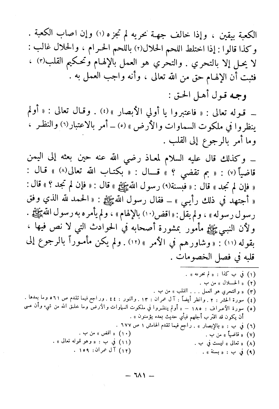الكعبة بيقين، وإذا خالف جهة نحريه لم تجزه (¬1) وإن أصاب الكعبة. وكذا قالوا: إذا اختلط اللحم الحلال (¬2) باللحم الحرام، والحلال غالب: لا يحل إلا بالتحري. والتحري هو العمل بالإلهام وتحكيم القلب (¬3)، فثبت أن الإلهام حق من الله تعالى، وأنه واجب العمل به.