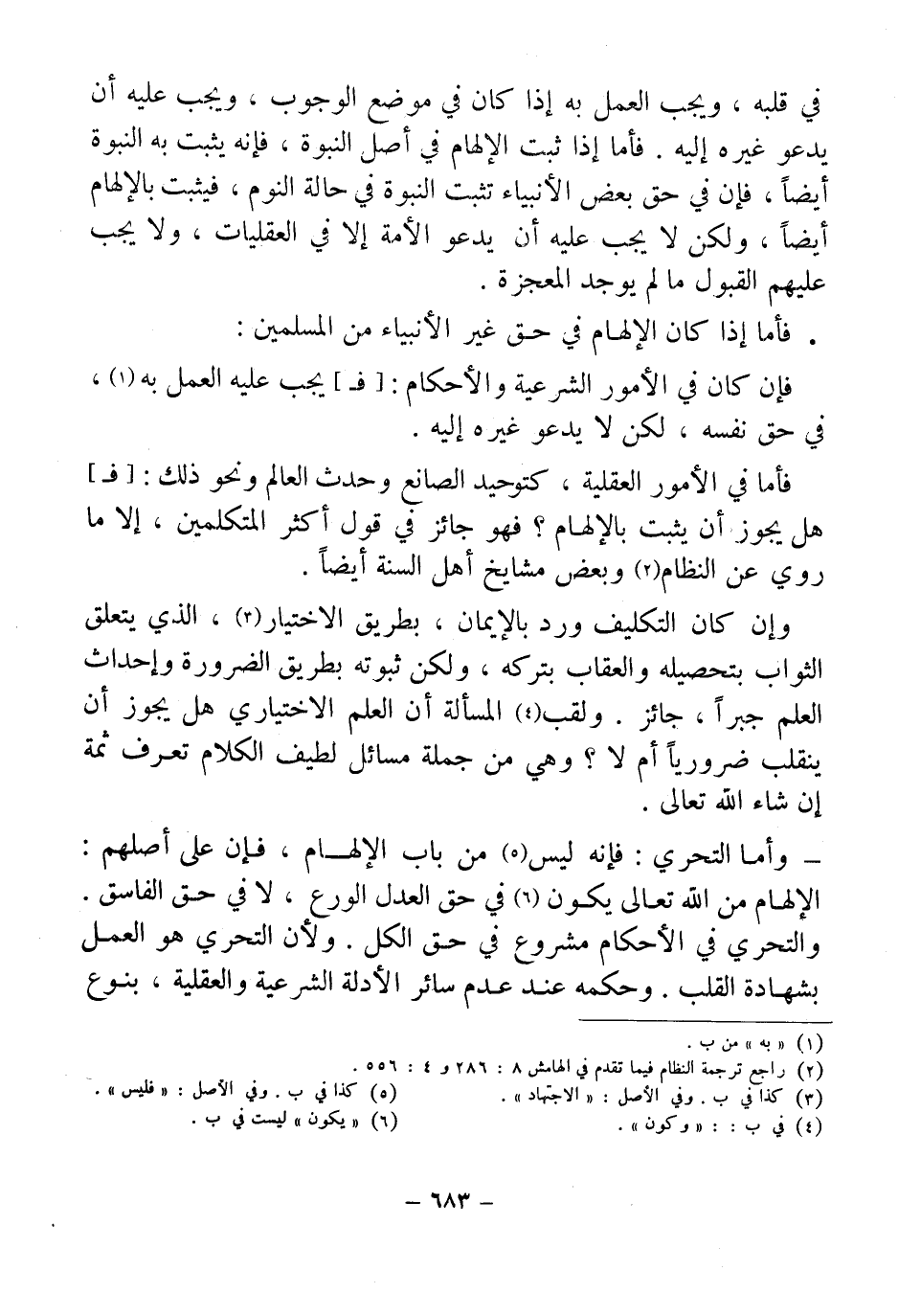 فأما في الأمور العقلية، كتوحيد الصانع وحدث العالم ونحو ذلك: [فـ] هل يجوز أن يثبت بالإلهام؟ فهو جائز في قول أكثر المتكلمين، إلا ما روي عن النظام (¬2) وبعض مشايخ أهل السنة أيضاً.