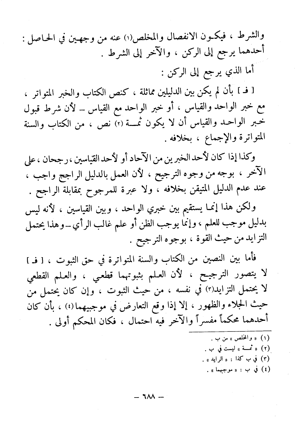 فأما بين النصين من الكتاب والسنة المتواترة في حق الثبوت، [فـ] لا يتصور الترجيح، لأن العلم بثبوتههما قطعي، والعلم القطعي لا يحتمل التزايد (¬3) في نفسه، من حيث الثبوت، وإن كان يحتمل من حيث الجلاء والظهور، إلا إذا وقع التعارض في موجبيهما (¬4)، بأن كان أحدهما محكماً مفسراً والآخر فيه احتمال، فكان المحكم أولى.