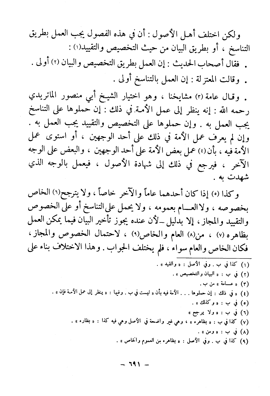 • وقال عامة (¬3) مشايخنا، وهو اختيار الشيخ أبي منصور الماتريدي رحمه الله: إنه ينظر إلى عمل الأمة في ذلك: إن حملوها على التناسخ يجب العمل به. وإن حملوها على التخصيص والتقييد يجب العمل به. وإن لم يعرف عمل الأمة في ذلك على أحد الوجهين، أو استوى على الأمة فيه، بأن (¬4) عمل بعض الأمة على أحد الوجهين، والبعض على الوجه الآخر، فيرجع في ذلك إلى شهادة الأصول، فيعمل بالوجه الذي شهدت به.