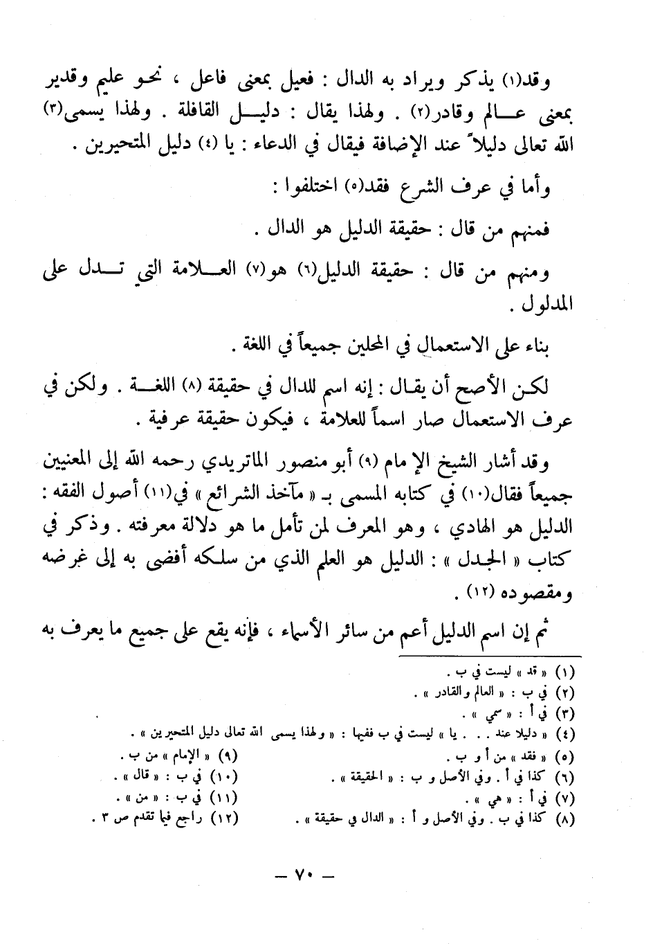وقد أشار الشيخ الإمام (¬9) أبو منصور الماتريدي رحمه الله إلى المعنيين جميعاً فقال (¬10) في كتابه المسمى بـ "مآخذ الشرائع" في (¬11) أصول الفقه: الدليل هو الهادي، وهو المعرف لمن تأمل ما هو دلالة معرفته. وذكر في كتاب "الجدل": الدليل هو العلم الذي من سلكه أفضى به إلى غرضه ومقصوده (¬12).