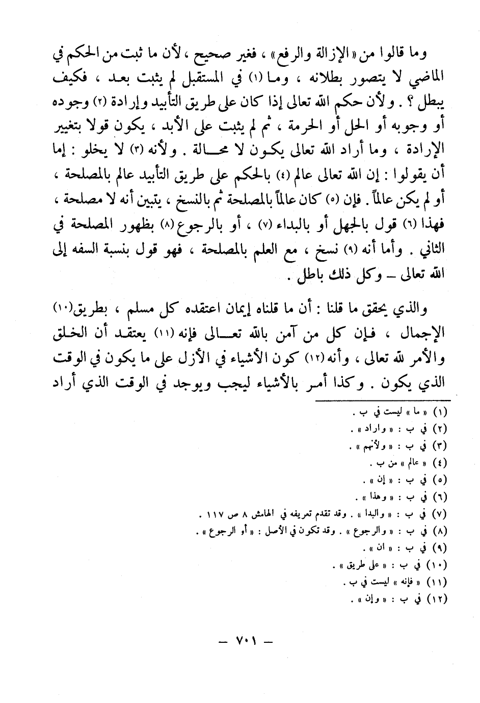 وما قالوا من "الإزالة والرفع"، فغير صحيح، لأن ما ثبت من الحكم في الماضي لا يتصور بطلانه، وما (¬1) في المستقبل لم يثبت بعد، فكيف يبطل؟. ولأن حكم الله تعالى إذا كان على طريق التأبيد وإرادة (¬2) وجوده أو وجوبه أو الحل أو الحرمة، ثم لم يثبت على الأبد، يكون قولا بتغيير الإرادة، وما أراد الله تعالى يكون لا محالة. ولأنه (¬3) لا يخلو: إما أن يقولوا: إن الله تعالى عالم (¬4) بالحكم على طريق التأبيد عالم بالمصلحة، أو لم يكن عالماً. فإن (¬5) كان عالماً بالمصلحة ثم بالنسخ، يتبين أنه لا مصلحة، فهذا (¬6) قول بالجهل أو بالبداء (¬7)، أو بالرجوع (¬8) بظهور المصلحة في الثاني. وأما أنه (¬9) نسخ، مع العلم بالمصلحة، فهو قول بنسبة السفه إلي الله تعالي - وكل ذلك باطل.