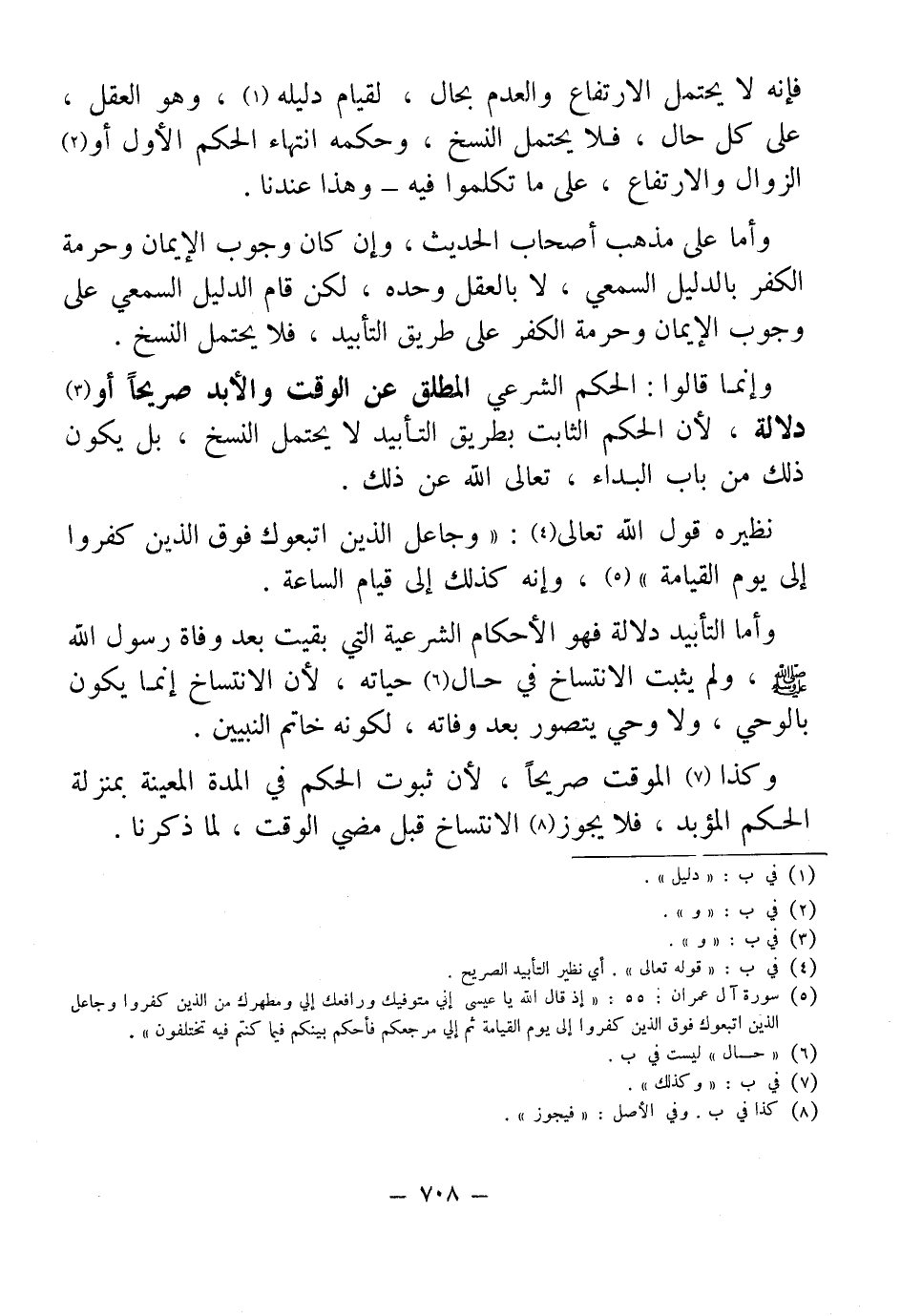 وأما علي مذهب أصحاب الحديث، وإن كان وجوب الإيمان وحرمة الكفر بالدليل السمعي، لا بالعقل وحده، لكن قام الدليل السمعي على وجوب الإيمان وحرمة الكفر علي طريق التأبيد، فلا يحتمل النسخ.