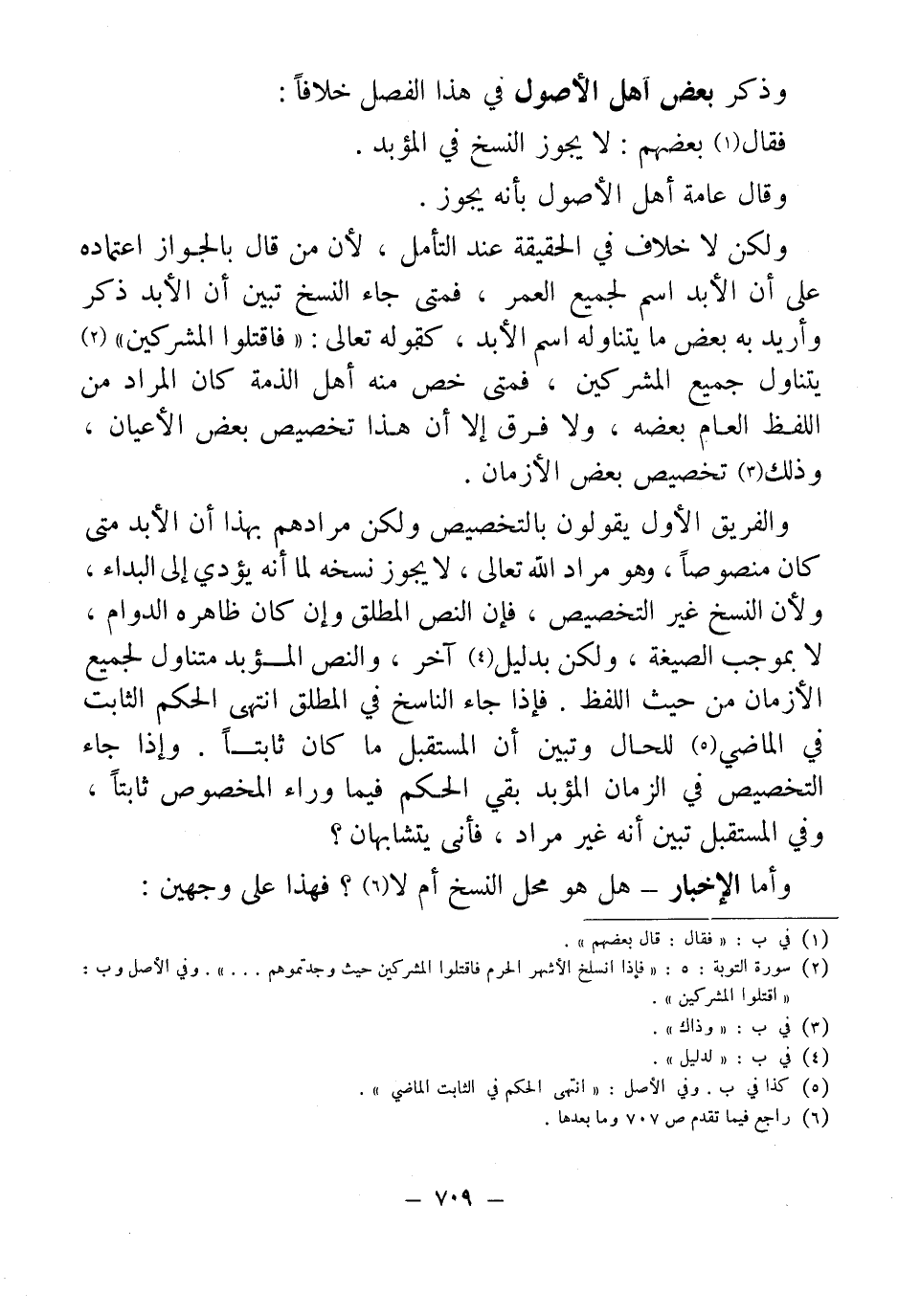 ولكن لا خلاف في الحقيقة عند التأمل، لأن من قال بالجواز اعتماده على أن الأبد اسم لجميع العمر، فمتى جاء النسخ تبين أن الأبد ذكر وأريد به بعض ما يتناوله اسم الأبد، كقوله تعالى: "فاقتلوا المشركين" (¬2) يتناول جيمع المشركين، فمتى خص منه أهل الذمة كان المراد من اللفظ العام بعضه، ولا فرق إلا أن هذا تخصيص بعص الأعيان، وذلك (¬3) تخصيص بعض الأزمان.