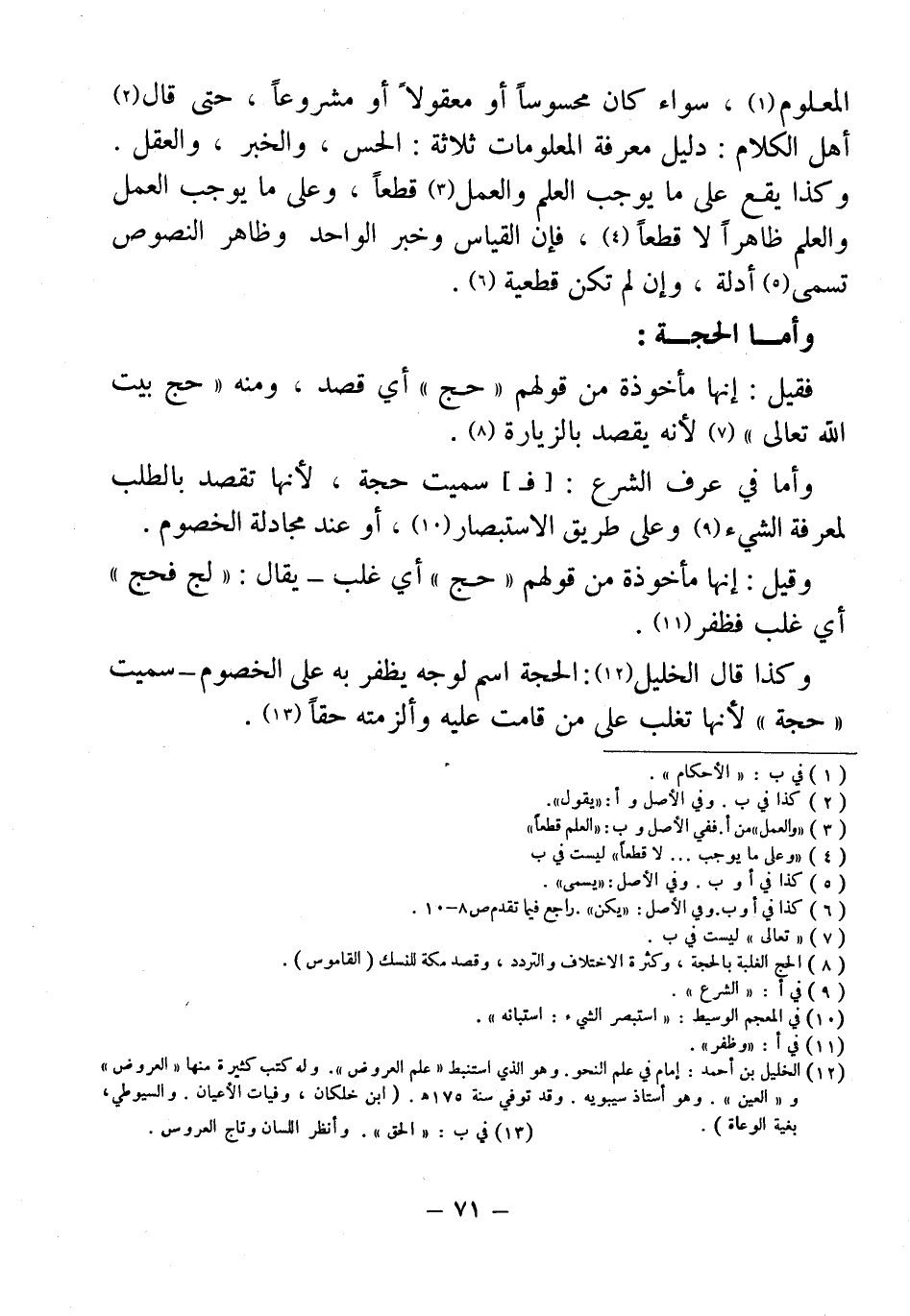 وكذا قال الخليل (¬12): الحجة اسم لوجه يظفر به على الخصوم - سميت "حجة" لأنها تغلب على من قامت عليه وألزمته حقًا (¬13).