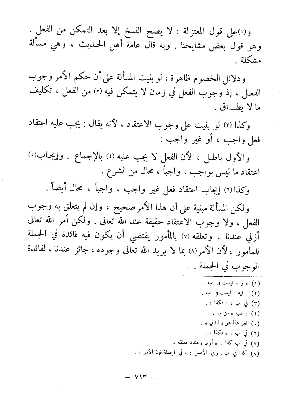 و (¬1) علي قول المعتزلة: لا يصح النسخ إلا بعد التمكن من الفعل. وهو قول بعض مشايخنا. وبه قال عامة أهل الحديث، وهي مسألة مشكلة.