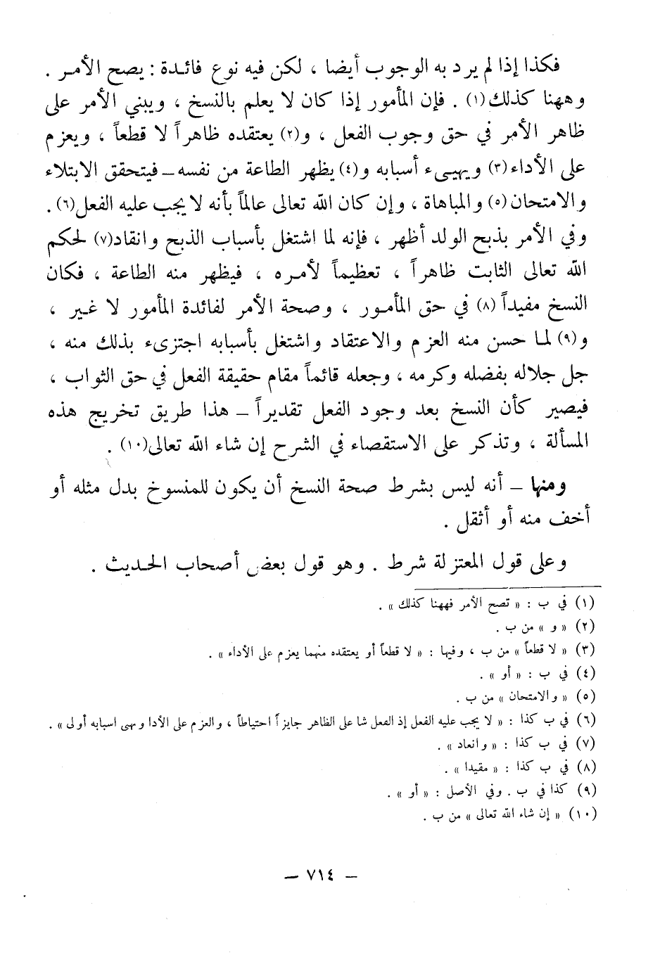 فكذا إذا لم يرد به الوجوب أيضا، لكن فيه نوع فائدة: يصح الأمر. وههنا كذلك (¬1). فإن الأمور إذا كان لا يعلم بالنسخ، ويبني الأمر على ظاهر الأمر في حق وجوب الفعل، و (¬2) يعتقده ظاهراً لا قطعاً، ويعزم على الأداء (¬3) ويهيئ أسبابه و (¬4) يظهر الطاعة من نفسه - فيتحقق الابتلاء والامتحان (¬5) والمباهاة، وإن كان الله تعالى عالماً بأنه لا يجب عليه الفعل (¬6). وفي الأمر بذبح الولد أظهر، فإنه لما اشتغل بأسباب الذبح وانقاد (¬7) لحكم الله تعالى الثابت ظاهراً، تعظيماً لأمره، فيظهر منه الطاعة، فكان النسخ مفيداً (¬8) في حق المأمور، وصحة الأمر لفائدة الأمور لا غير، و (¬9) لما حسن منه العزم والاعتقاد واشتغل بأسبابه اجتزئ بذلك منه، جل جلاله بفضله وكرمه، وجعله قائماً مقام حقيقة الفعل وفي حق الثواب، فيصير كأن النسخ بعد وجود الفعل تقديراً - هذا طريق تخريج هذه المسألة، وتذكر على الاستقصاء في الشرح إن شاء الله تعالى (¬10).