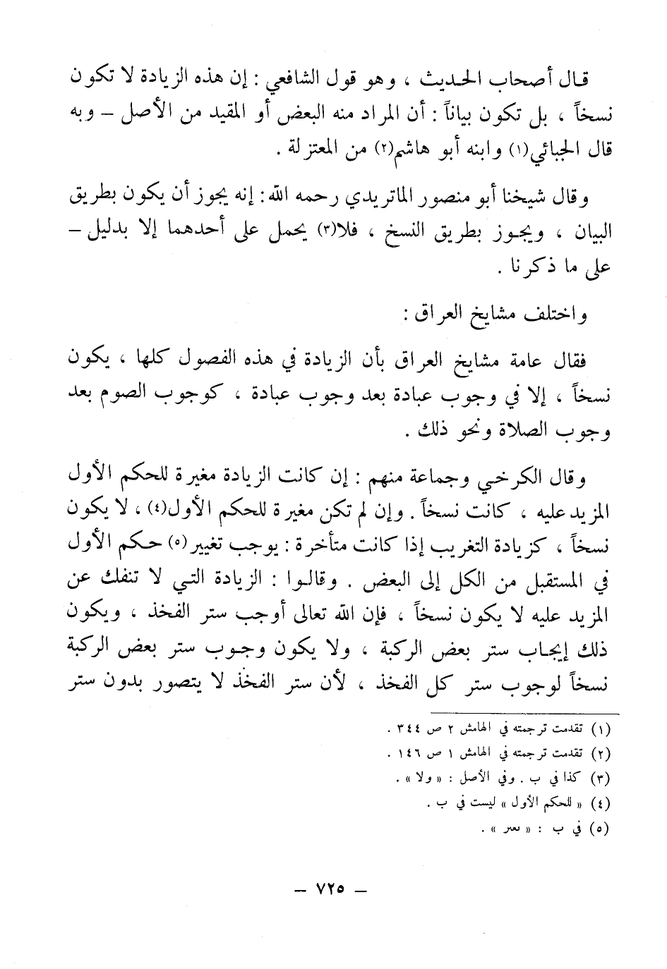 فقال عامة مشايخ العراق بأن الزيادة في هذه الفصول كلها، يكون نسخاً، إلا في وجوب عبادة بعد وجوب عبادة، كوجوب الصوم بعد وجوب الصلاة ونحو ذلك.