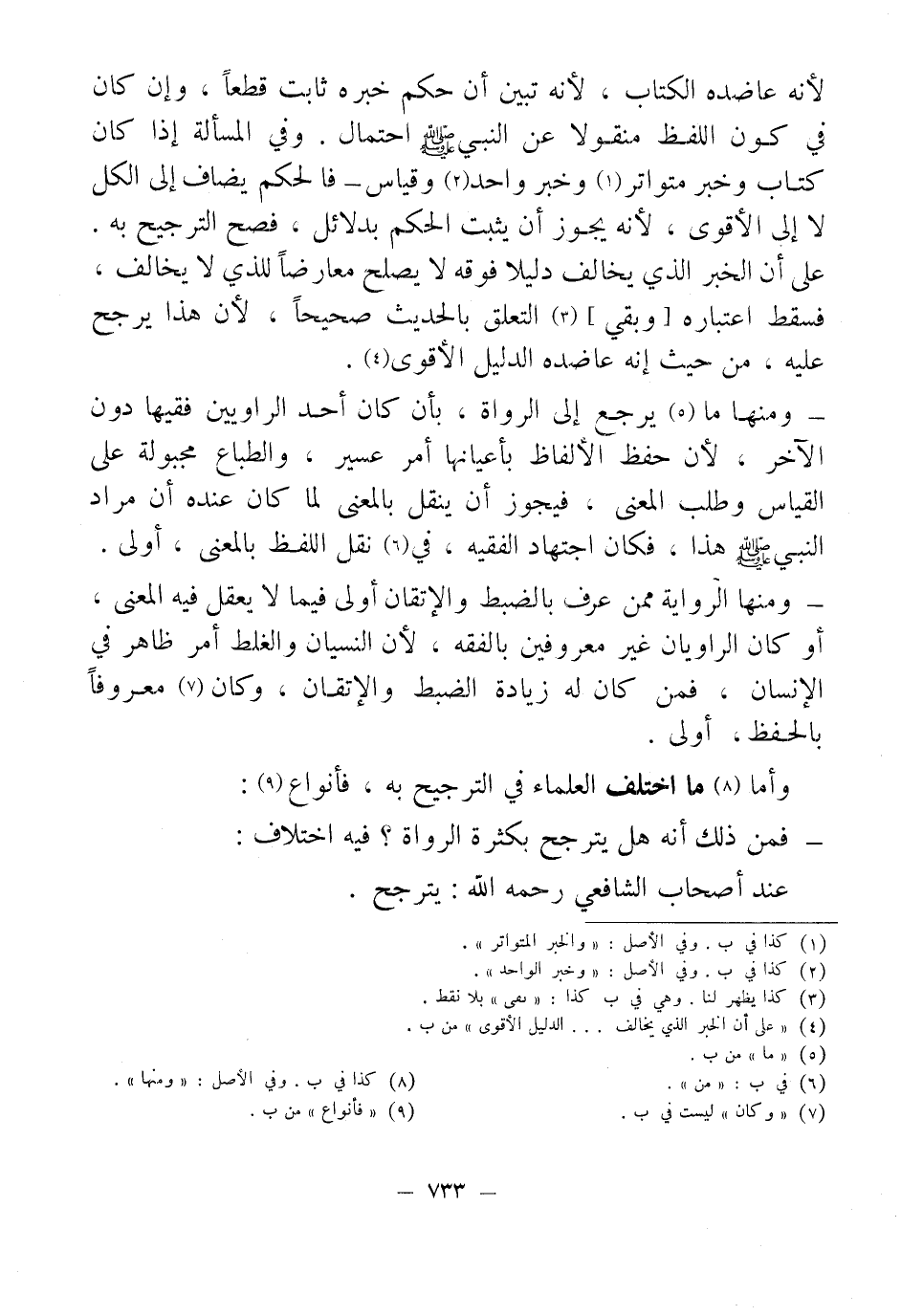 - ومنها ما (¬5) يرجع إلى الرواة، بأن كان أحد الراويين فقيها دون الآخر, لأن حفظ الألفاظ بأعينها أمر عسير، والطباع مجبولة على القياس وطلب المعنى, فيجوز أن ينقل بالمعنى لما كان عنده أن مراد النبي - صلى الله عليه وسلم - هذا كان اجتهاد الفقيه, في (¬6) نقل اللفظ بالمعنى، أولى.