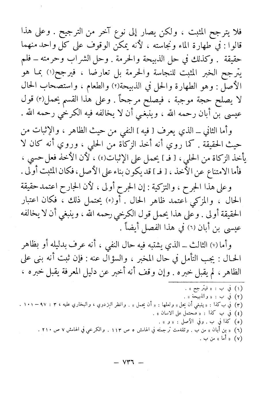 فلا يترجح المثبت, ولكن يصار إلى نوع آخر من الترجيح. وعلى هذا قالوا: في طهارة الماء ونجاسته، لأنه يمكن الوقوف على كل واحد، كل منها حقيقة. وكذلك في حل الذبيحة والحرمة. وحل الشراب وحرمته - فلم يترجح الخبر المثبت للنجاسة والحرمة بل تعارضا، فيرجح (¬1) بما هو الأصل: وهو الطهارة والحل في الذبيحة (¬2) والطعام، واستصحاب الحال لا يصلح حجة موجبة، فيصلح مرجحًا. وعلى هذا القسم يحمل (¬3) قول عيسى بن أبان رحمه الله، وينبغي أن لا يخالفه فيه الكرخي رحمه الله.