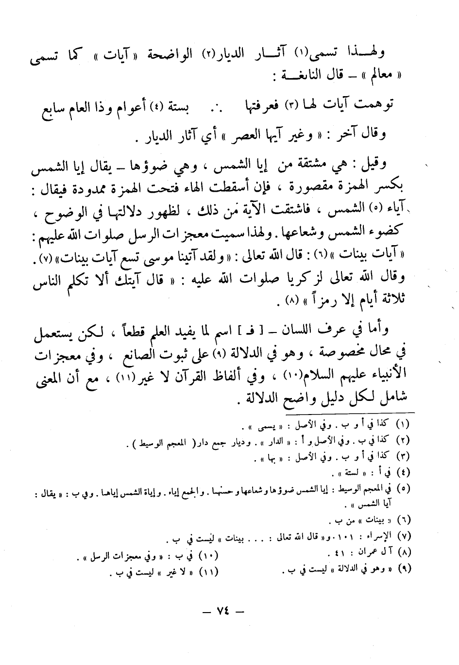 وقيل: هي مشتقة من إيا الشمس، وهي ضوؤها - يقال إيا الشمس بكسر الهمزة مقصورة، فإن أسقطت الهاء فتحت الهمزة ممدودة فيقال: آياء (¬5) الشمس، فاشتقت الآية من ذلك، لظهور دلالتها في الوضوح، كضوء الشمس وشعاعها. ولهذا سميت معجزات الرسل صلوات الله عليهم: "آيات بينات" (¬6): قال الله تعالى: "ولقد آتينا موسى تسع آيات بينات" (¬7). وقال الله تعالى لزكريا صلوات الله عليه: "قال آيتك ألا تكلم الناس ثلاثة أيام إلا رمزًا" (¬8).
