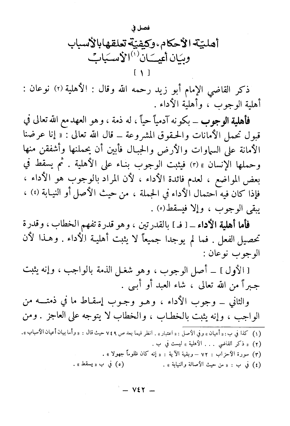 فأهلية الوجوب - بكونه أدميًا حيًا، له ذمة، وهو العهد مع الله تعالى في قبول تحمل الأمانات والحقوق المشروعة - قال الله تعالى: "إنا عرضنا الأمانة على السماوات والأرض والجبال فأبين أن يحملنها وأشفقن منها وحملها الإنسان" (¬3) فيثبت الوجوب بناء على الأهلية. ثم يسقط في بعض المواضع، لعدم فائدة الأداء, لأن المراد بالوجوب هو الأداء، فإذا كان فيه احتمال الأداء في الجملة، من حيث الأصل أو النيابة (¬4)، يبقى الوجوب، وإلا فيسقط (¬5).