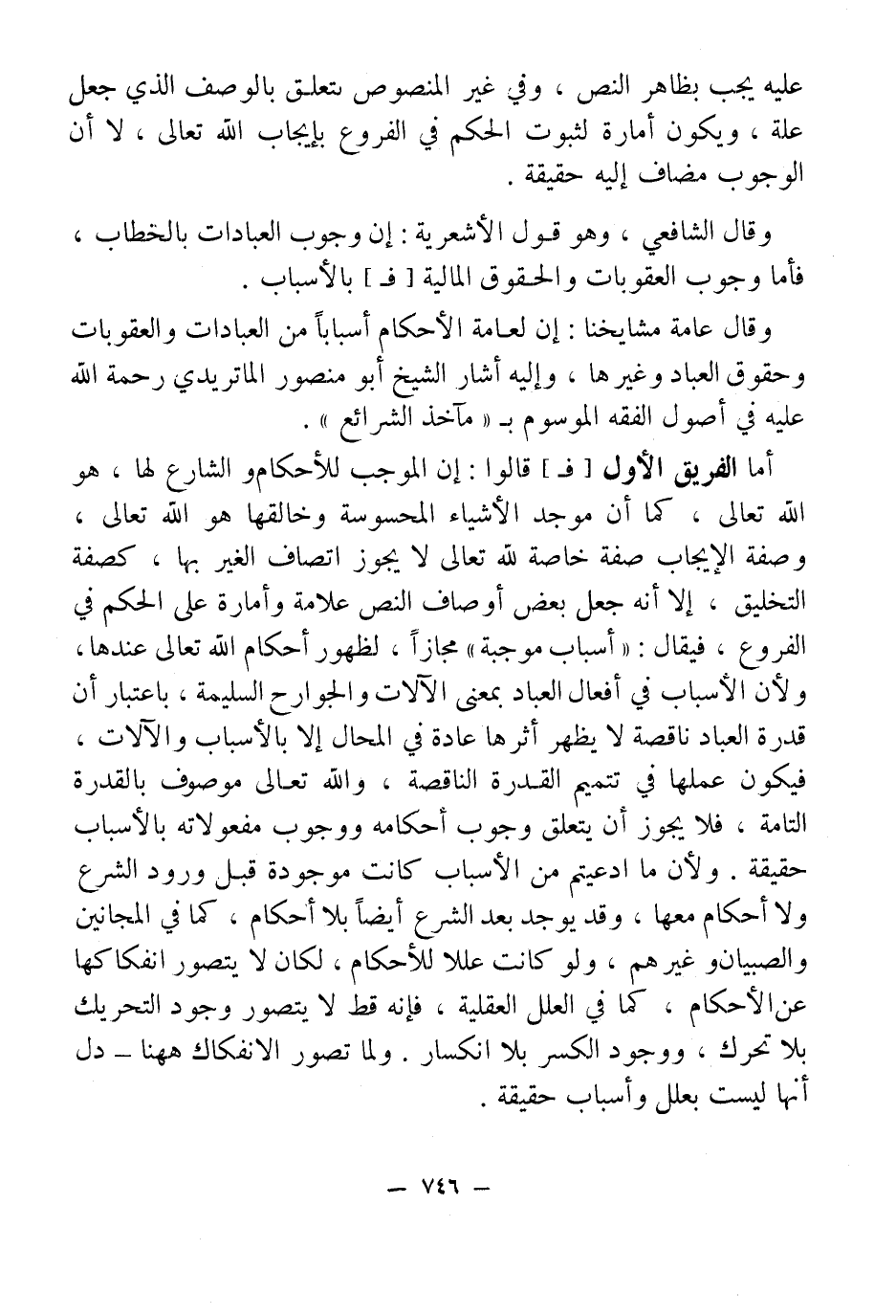 أما الفريق الأول [فـ] قالوا: إن الموجب للأحكام والشارع لها، هو الله تعالى، كما أن موجد الأشياء المحسوسة وخالقها هو الله تعالى، وصفة الإيجاب صفة خاصة لله تعالى لا يجوز اتصاف الغير بها، كصفة التخليق، إلا أنه جعل بعض أوصاف النص علامة وأمارة على الحكم في الفروع، منه قال: "أسباب موجبة" مجازاً، لظهور أحكام الله تعالى عندها، ولأن الأسباب في أفعال العباد بمعنى الآلات والجوارح السليمة، باعتبار أن قدرة العباد ناقصه لا يظهر أثرها عادة في المحال إلا بالأسباب والآلات، فيكون عملها في تتميم القدرة الناقصة، والله تعالى موصوف بالقدرة التامة، فلا يجوز آن يتعلق وجوب أحكامه ووجوب مفعولاته بالأسباب حقيقة. ولأن ما ادعيتم من الأسباب كانت موجودة قبل ورود الشرع ولا أحكام معها، وقد يوجد بعد الشرع أيضًا بلا أحكام، كما في المجانين والصبيان وغيرهم، ولو كانت عللا للأحكام، لكان لا يتصور انفكاكها عن الأحكام، كما في العلل العقلية، فإنه قط لا يتصور وجود التحريك بلا تحرك، ووجود الكسر بلا انكسار. ولما تصور الانفكاك ههنا - دل أنها ليست بعلل وأسباب حقيقة.