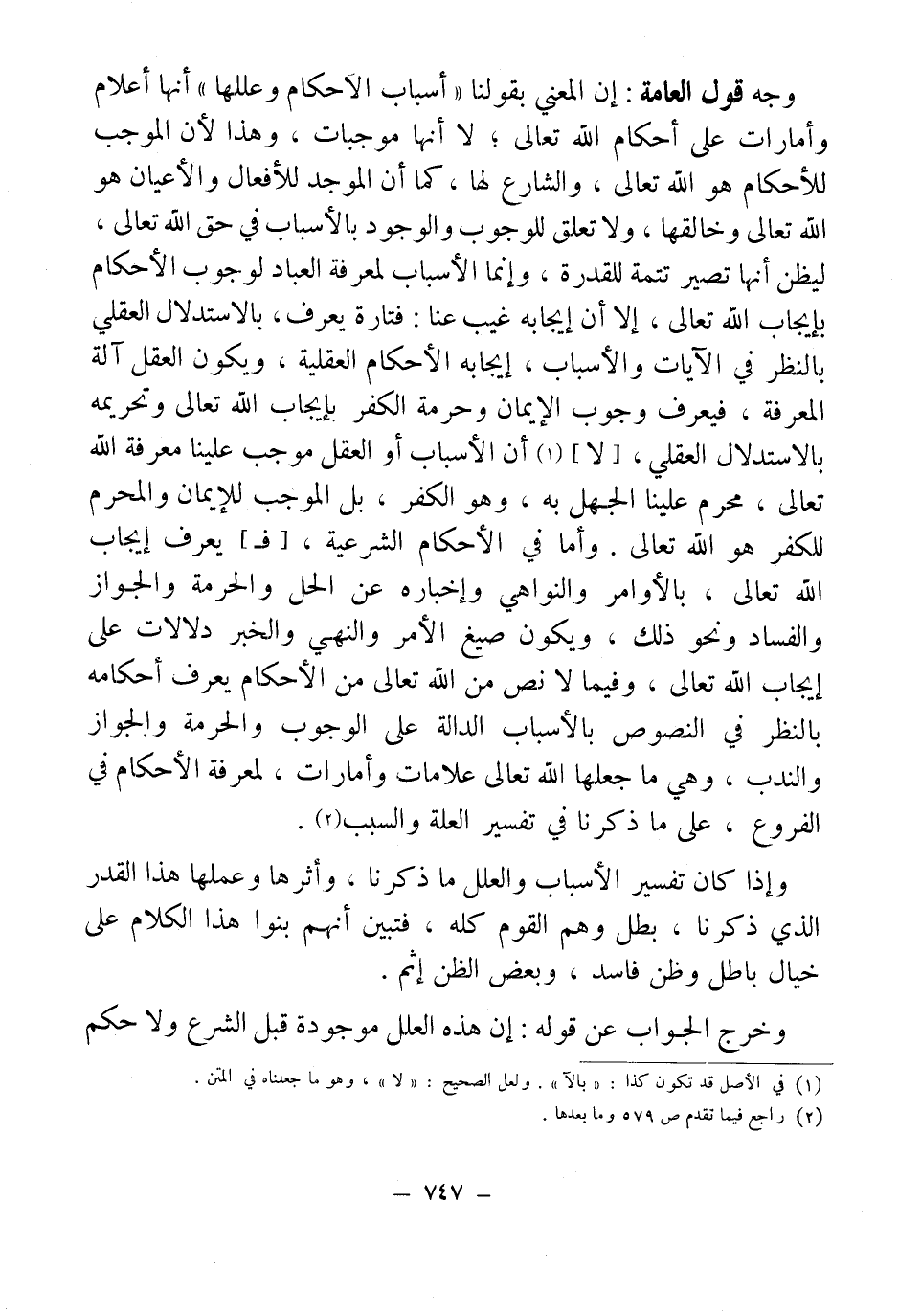 وجه قول العامة: إن المعني بقولنا "أسباب الأحكام وعللها" أنهما أعلام وأمارات على أحكام الله تعالى؛ لا أنها موجبات، وهذا لأن الموجب للأحكام هو الله تعالى، والشارع لها، كما أن الموجد للأفعال والأعيان هو الله تعالى وخالقها, ولا تعلق للوجوب والوجوب بالأسباب في حق الله تعالى، ليظن أنها تصير تتمة للقدرة، وإنما الأسباب لمعرفة العباد لوجوب الأحكام بإيجاب الله تعالى، إلا أن إيجابه غيب عنا: فتارة يعرف، بالاستدلال العقلي بالنظر في الآيات والأسباب، إيجابه الأحكام العقلية، ويكون العقل آلة المعرفة، فيعرف وجوب الإيمان وحرمة الكفر بإيجاب الله تعالى وتحريمه بالاستدلال العقلي، [لا] (¬1) أن الأسباب أو العقل موجب علينا معرفة الله تعالى، محرم علينا الجهل به، وهو الكفر، بل الموجب للإيمان والمحرم للكفر هو الله تعالى. وأما في الأحكام الشرعية، [فـ] يعرف إيجاب الله تعالى، بالأوامر والنواهي وإخباره عن الحل والحرمة والجواز والفساد ونحو ذلك، ويكون صيغ الأمر والنهي والخبر دلالات على إيجاب الله تعالى، وفيما لا نص من الله تعالى من الأحكام يعرف أحكامه بالنظر في النصوص بالأسباب الدالة على الوجوب والحرمة والجواز والندب، وهي ما جعلها الله تعالى علامات وأمارات، لمعرفة الأحكام في الفروع، على ما ذكرنا في تفسير العلة والسبب (¬2).