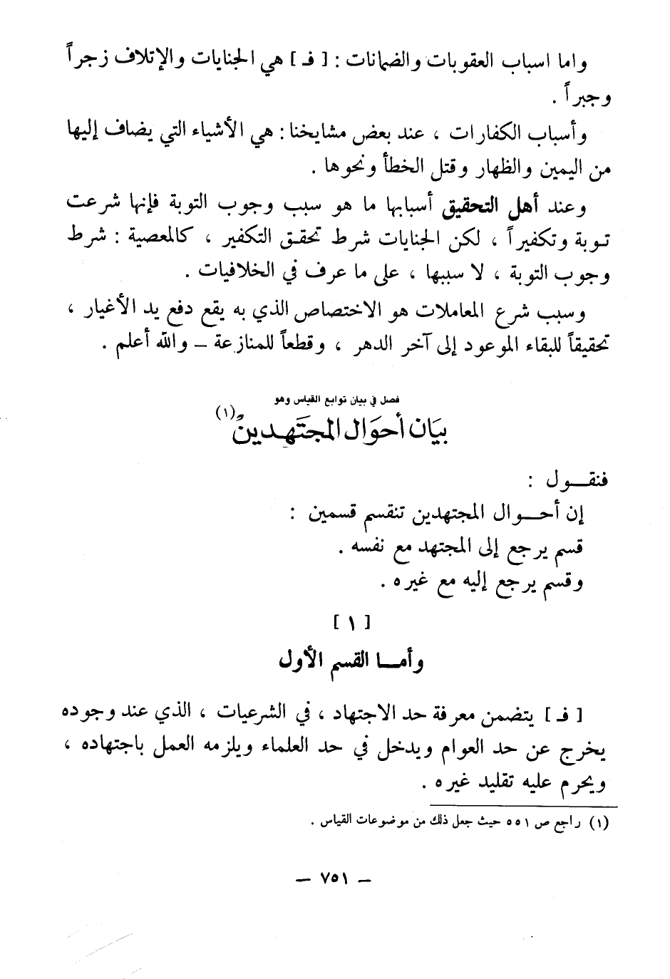 [فـ] يتضمن معرفة حد الاجتهاد، في الشرعيات، الذي عند وجوده يخرج عن حد العوام ويدخل في حد العلماء ويلزمه العمل باجتهاده، ويحرم عليه تقليد غيره.