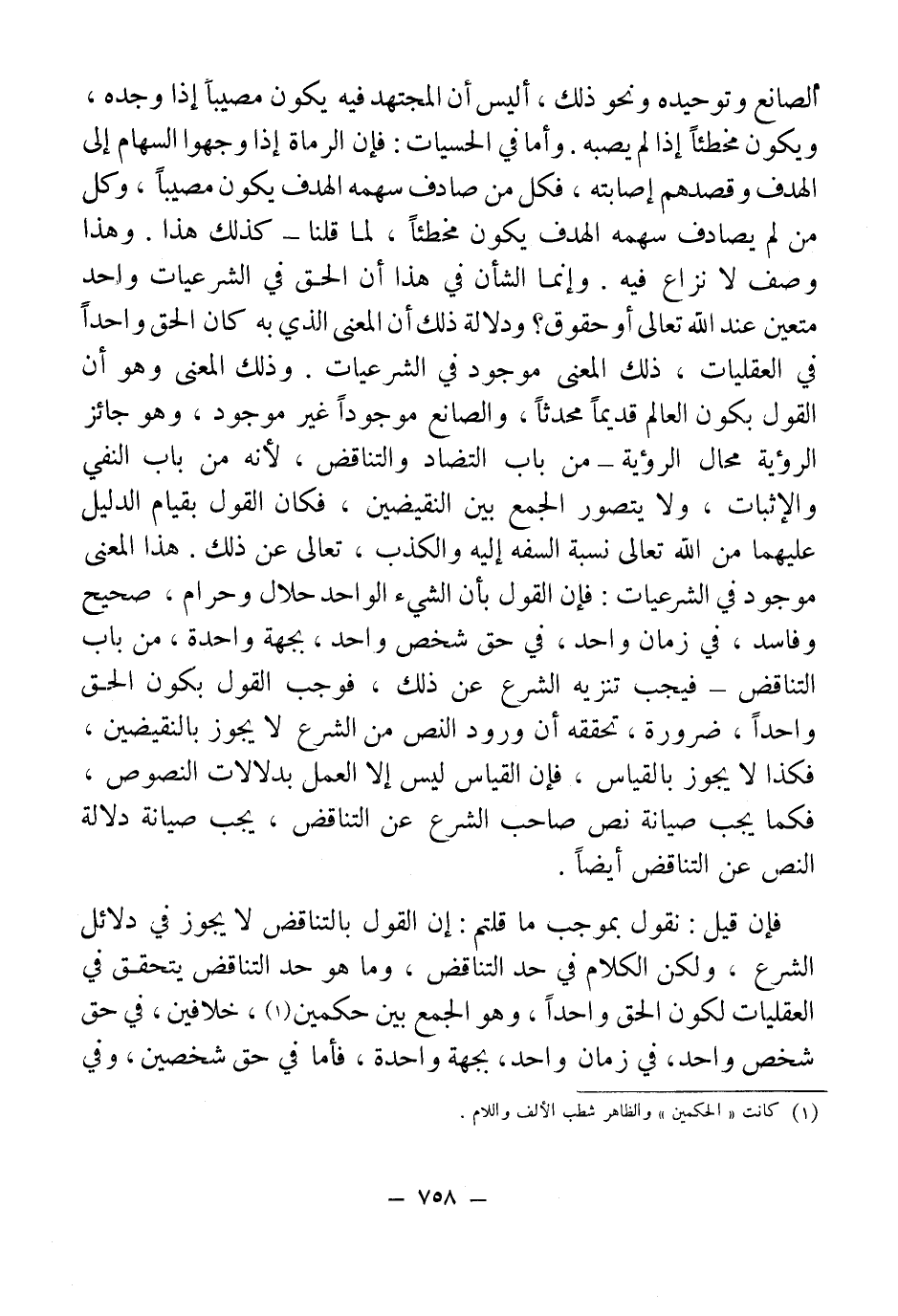 ألصانع وتوحيده ونحو ذلك، أليس أن المجتهد فيه يكون مصيباً إذا وجده، ويكون مخطئاً إذا لم يصبه. وأما في الحسيات: فإن الرماة إذا وجهوا السهام إلى الهدف وقصدهم إصابته، فكل من صادف سهمه الهدف يكون مصيباً، وكل من لم يصادف سهمه الهدف يكون مخطئاً، لما قلنا - كذلك هذا. وهذا وصف لا نزاع فيه. وإنما الشأن في هذا أن الحق في الشرعيات واحد متعين عند الله تعالى أو حقوق؟ ودلالة ذلك أن المعنى الذي به كان الحق واحدًا في العقليات، ذلك المعنى موجود في الشرعيات. وذلك المعنى وهو أن القول يكون العالم قديماً محدثاً، والصانع موجودًا غير موجود، وهو جائز الرؤية محال الرؤية - من باب التضاد والتناقض, لأنه من أبواب النفي والإثبات، ولا يتصور الجمع بين النقيضين، فكان القول بقيام الدليل عليهما من الله تعالى نسبة السفه إليه والكذب، تعالى عن ذلك. هذا المعنى موجود في الشرعيات: فإن القول بأن الشيء الواحد حلال وحرام، صحيح وفاسد، في زمان واحد، في حق شخص واحد، بجهة واحدة، من باب التناقض - فيجب تنزيه الشرع عن ذلك، فوجب القول بكون الحق واحدًا، ضرورة، تحققه أن ورود النص من الشرع لا يجوز بالنقيضين، فكذا لا يجوز بالقياس، فإن القياس ليس إلا العمل بدلالات النصوص، فكما يجب صيانة نص صاحب الشرع عن التناقض، يجب صيانة دلالة النص عن التناقض أيضًا.