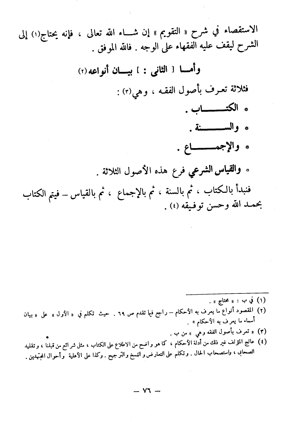 (¬2) المقصود أنواع ما يعرف به الأحكام - راجع فيما تقدم ص 69. حيث تكلم في "الأول" على "بيان أسماء ما يعرف به الأحكام".