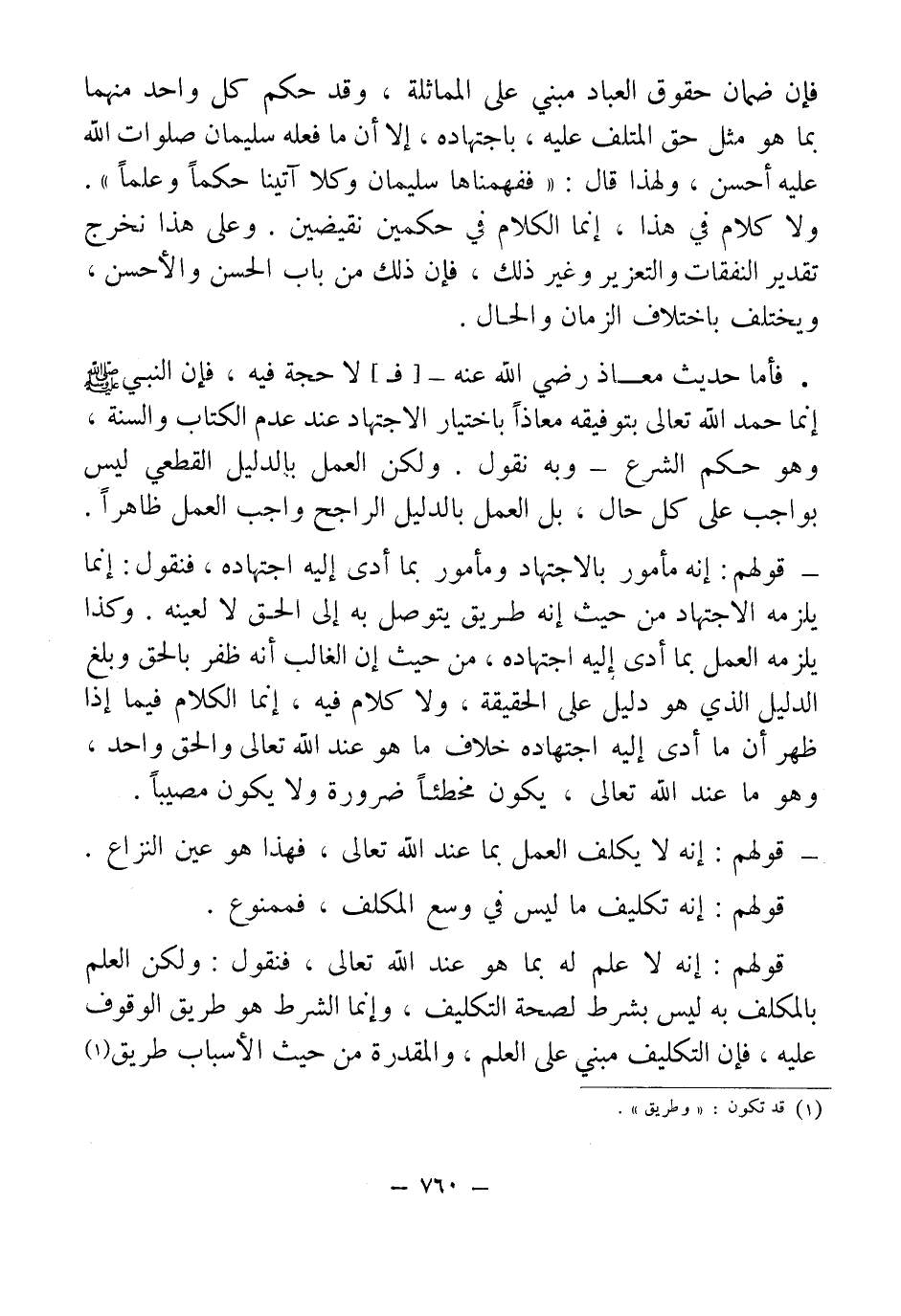 فإن ضمان حقوق العباد مبني على المماثلة، وقد حكم كل واحد منهما بما هو مثل حق المتلف عليه، باجتهاده، إلا أن ما فعله سليمان صلوات الله عليه أحسن، ولهذا قال: " ففهمناها سليمان وكلا آتينا حكمًا وعلمًا". ولا كلام في هذا, إنما الكلام في حكمين نقيضين. وعلى هذا نخرج تقدير النفقات والتعزير وغير ذلك، فإن ذلك من باب الحسن والأحسن، ويختلف باختلاف الزمان والحال.