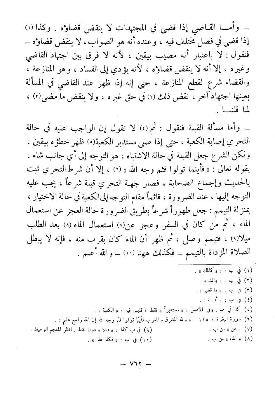 - وأما القاضي إذا قضى في المجتهدات لا ينقض قضاؤه. وكذا (¬1) إذا قضى في فصل مختلف فيه، وعنده أنه هو الصواب، لا ينقض قضاؤه - فنقول: لا باعتبار أنه مصيب بيقين, لأنه لا فرق بين اجتهاد القاضي وغيره، إلا أنه لا ينقض قضاؤه, لأنه يؤدي إلى الفساد، وهو المنازعة، والقضاء شرع لقطع المنازعة، حتى إنه إذا ظهر عند القاضي في المسألة بعينها اجتهاد آخر، نقض ذلك (¬2) في حق غيره، ولا ينقض ما مضى (¬3)، لما قلنا.